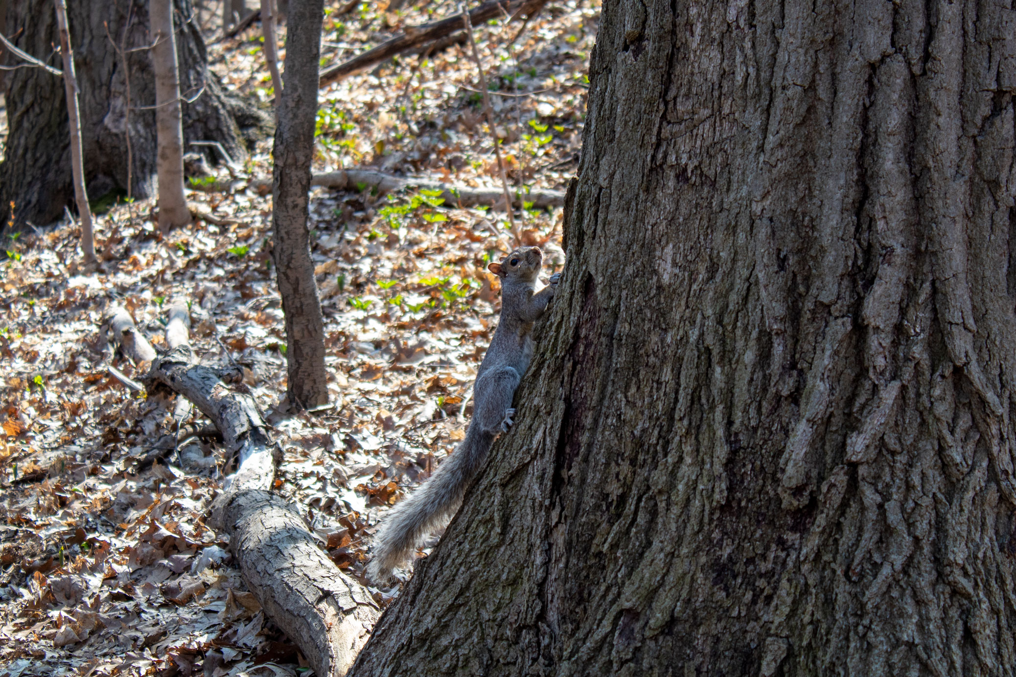 Descriptive text: Squirrel clinging to the side of a tree in the woods