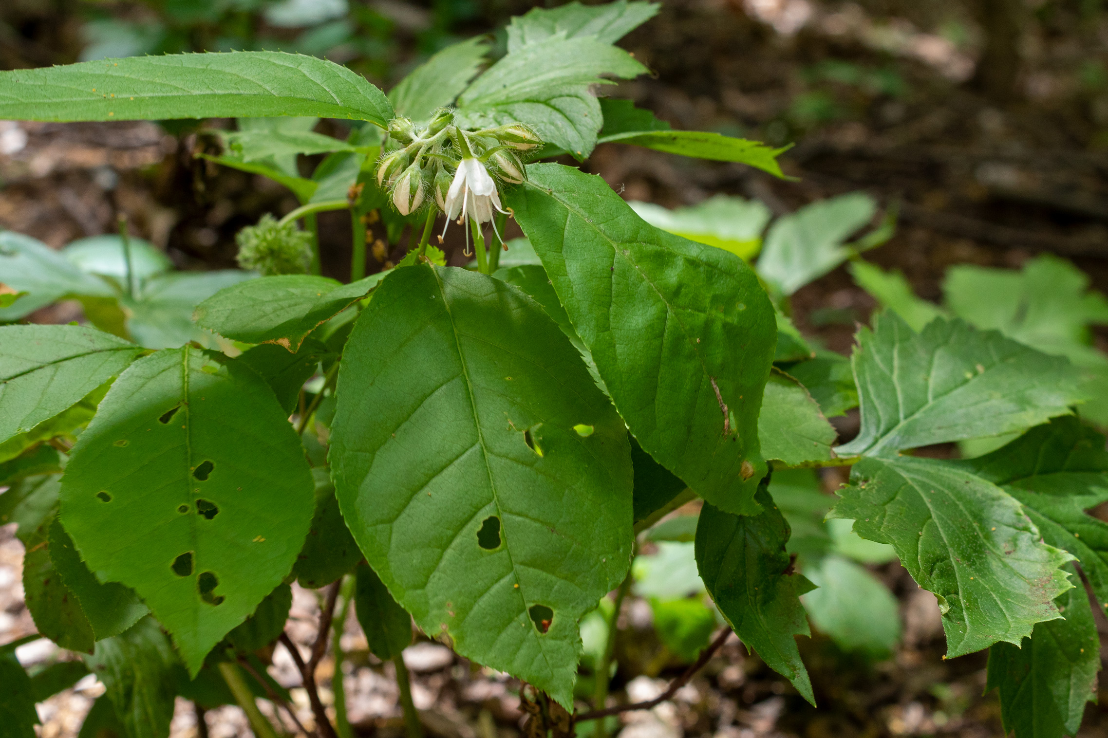 Descriptive text: Small white flowers budding on a green plant