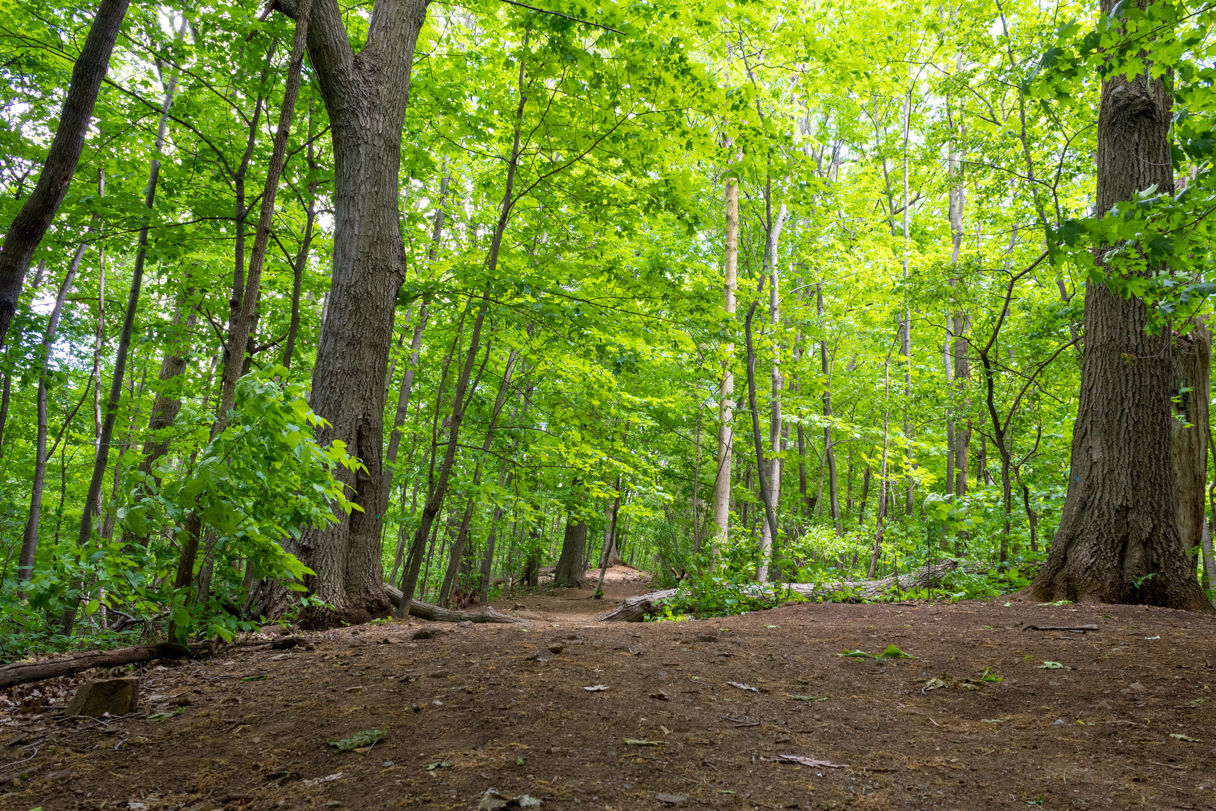 Descriptive text: A path in a forest surrounded by green trees