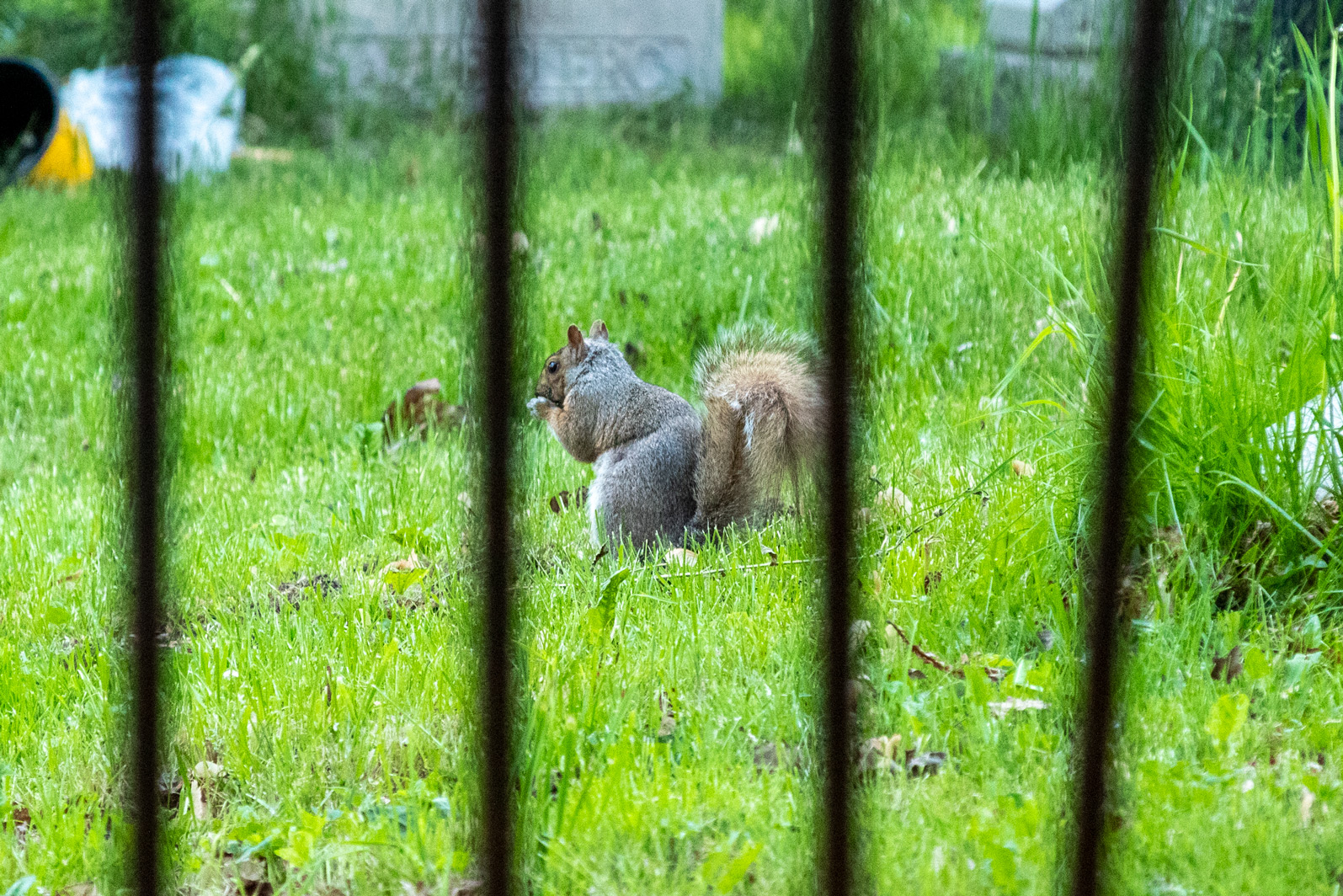 Descriptive text: Squirrel in the grass framed by the bars of a metal fence