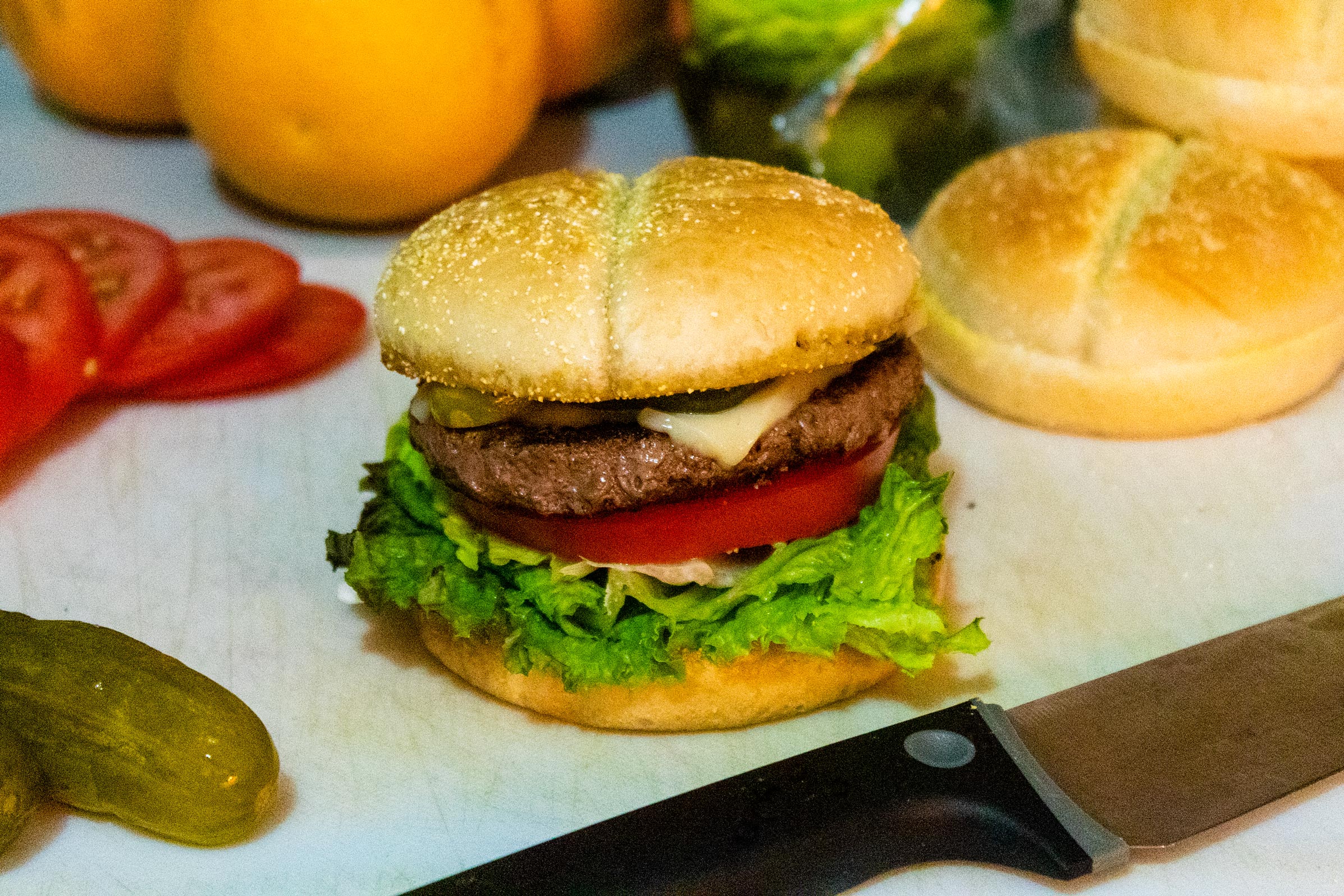 Descriptive text: Hamburger with lettuce, tomatoes, cheese, and pickles surrounded by ingredients