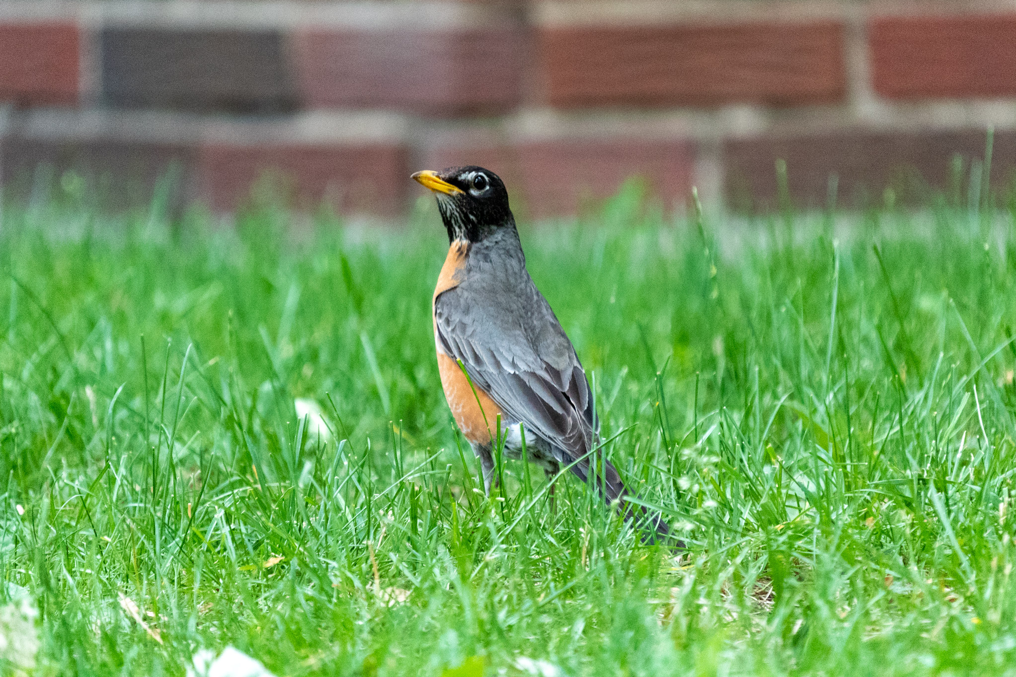 Descriptive text: Robin standing in the grass in front of a brick wall