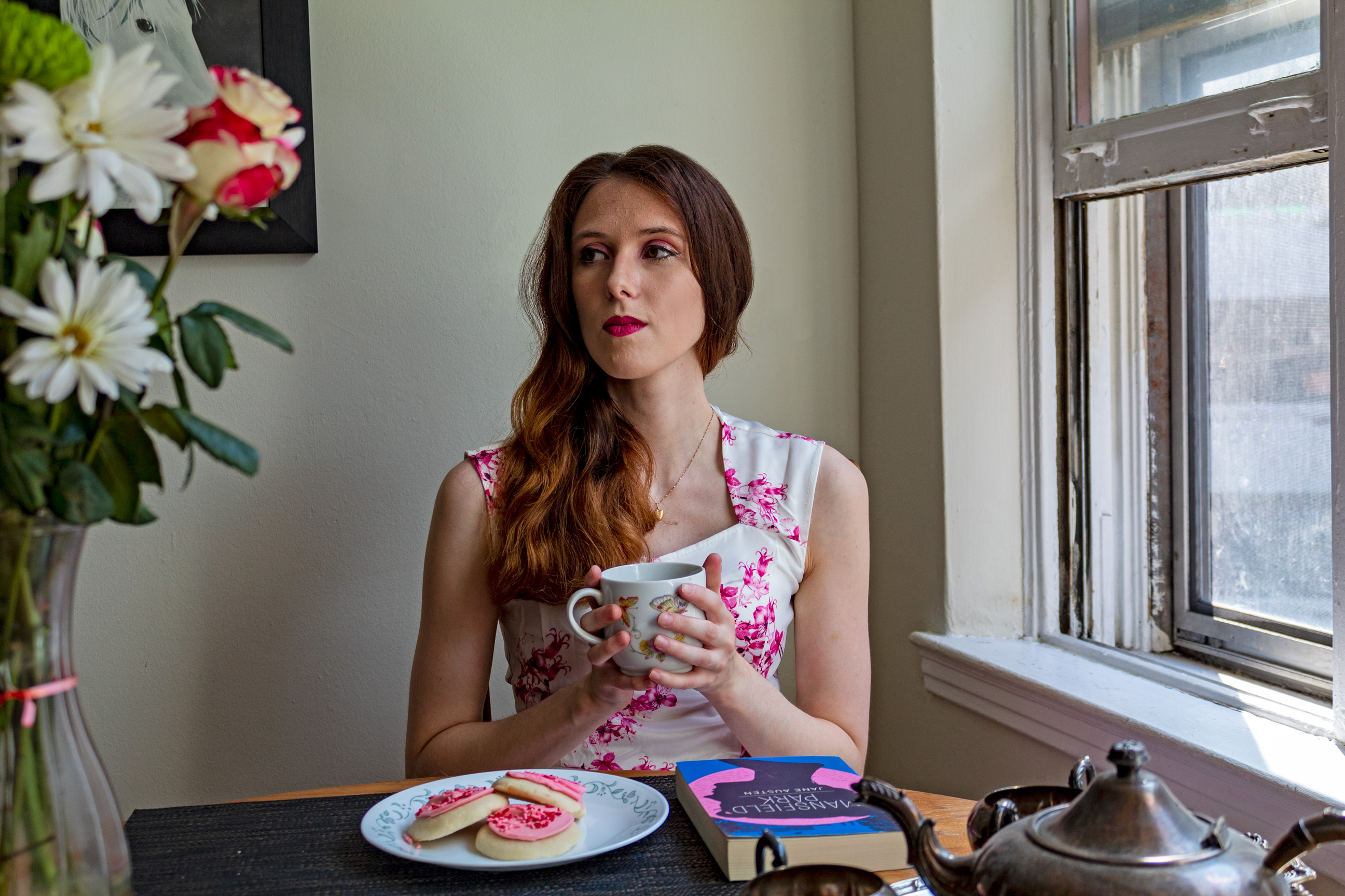 Descriptive text: Woman holding a tea cup and gazing at a vase of flowers; in front of her are cookies and a book