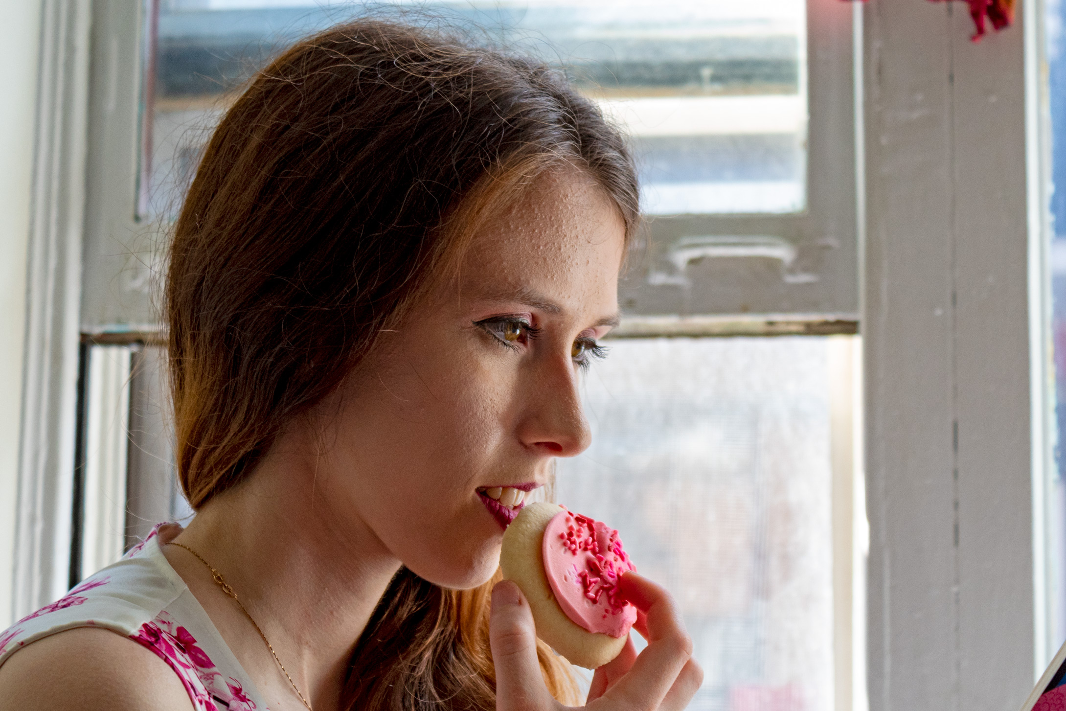 Tags: cookie, person, pink, portrait, white, woman