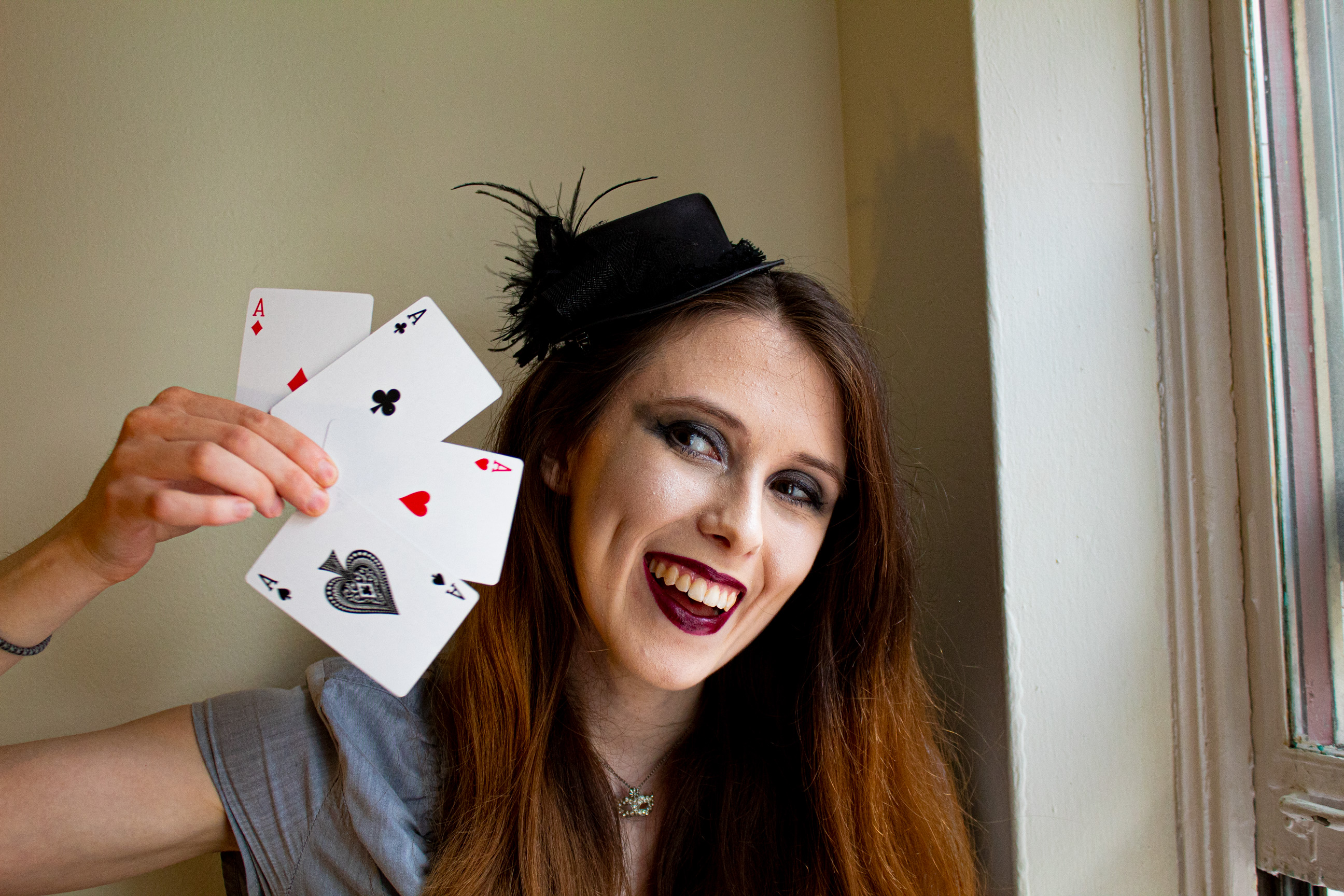 Descriptive text: Woman holding a hand of aces next to her face. She's wearing a black had and a grey skirt, with purple and white makeup (the colours of the ace flag)
