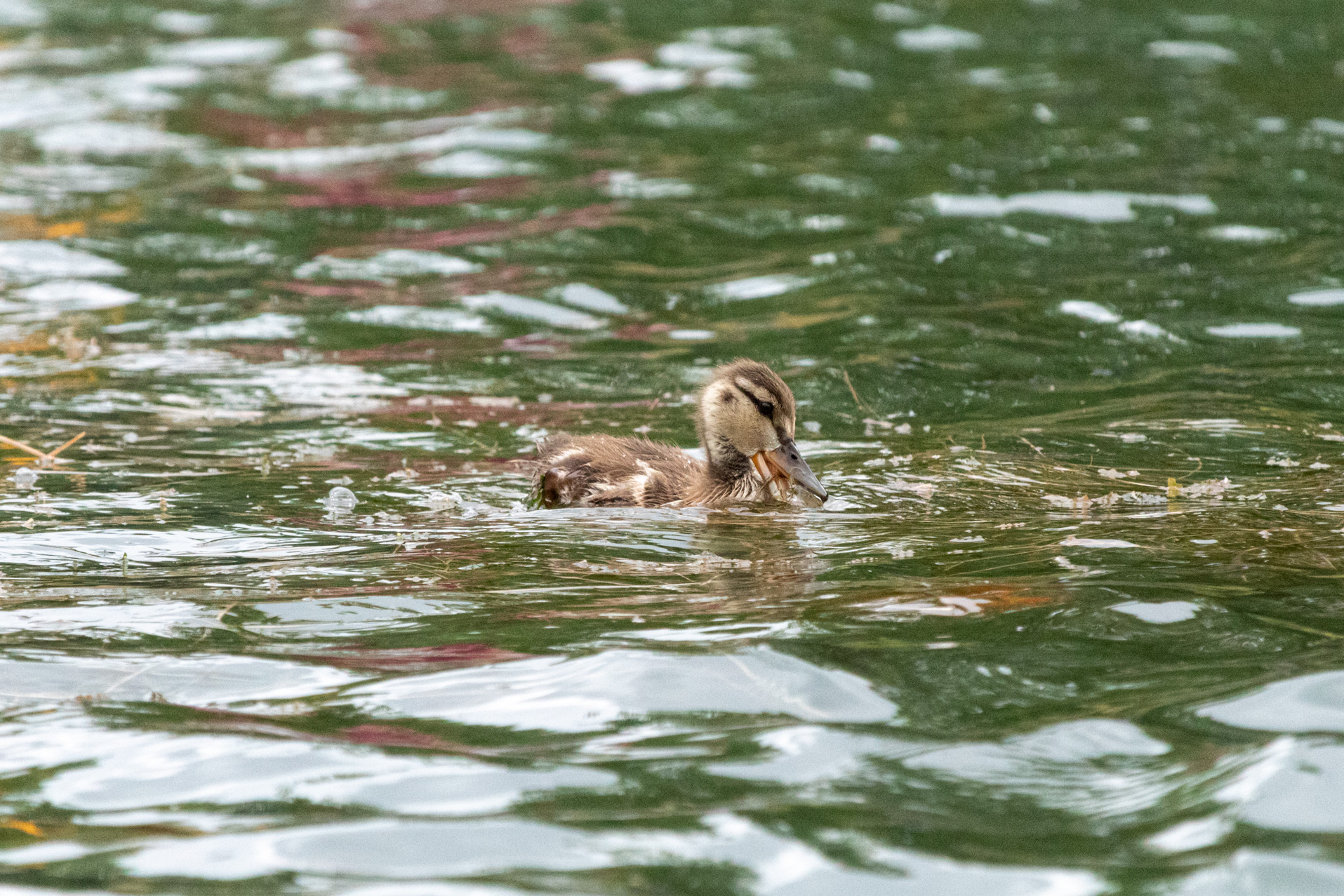 Descriptive text: Baby mallard duck swimming and munching on seaweed