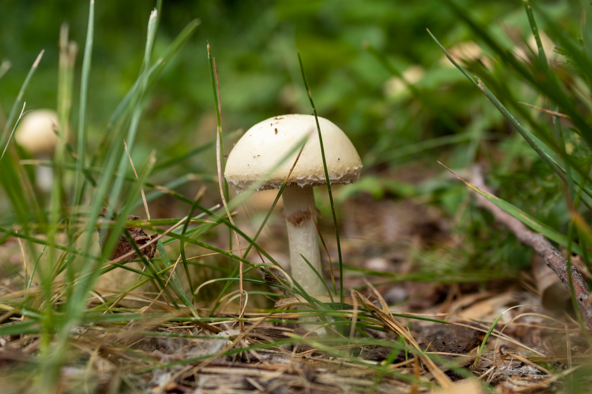Descriptive text: Mushroom sprouting out of the ground surrounded by grass