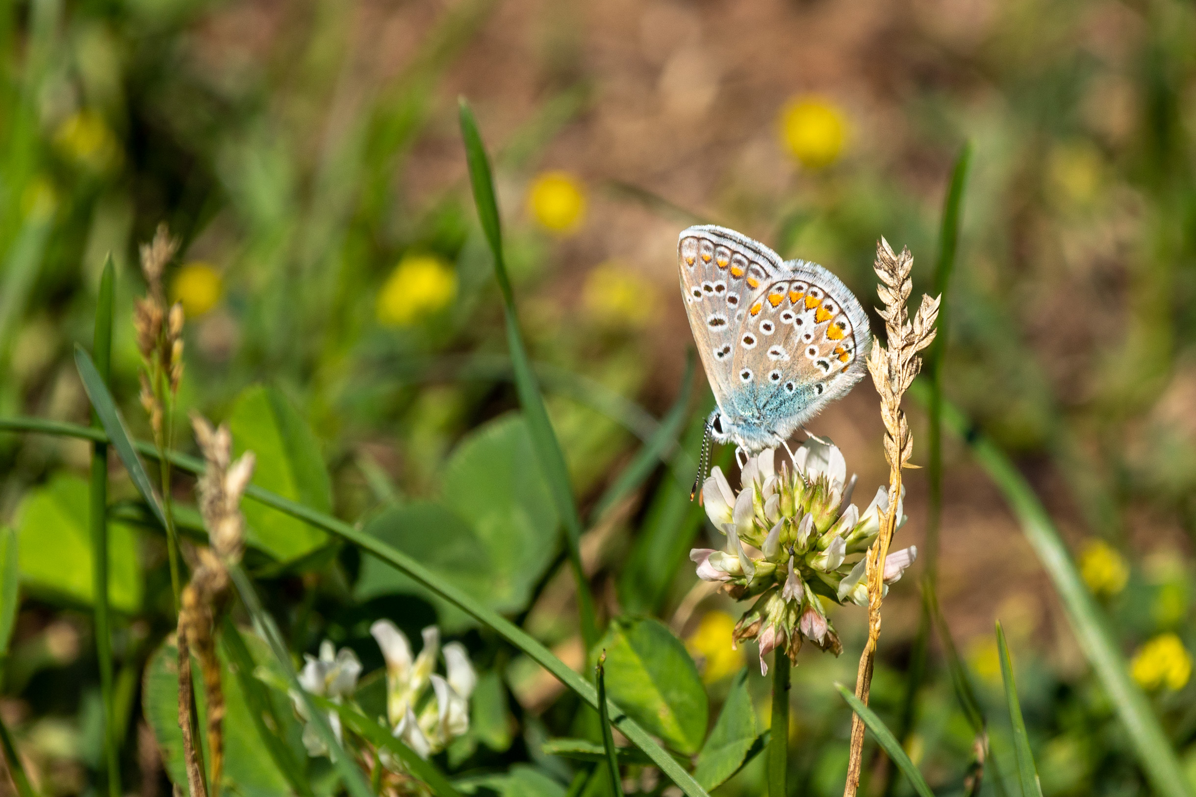 Tags: arthropod, black, blue, butterfly, clover, flower, insect, orange, white