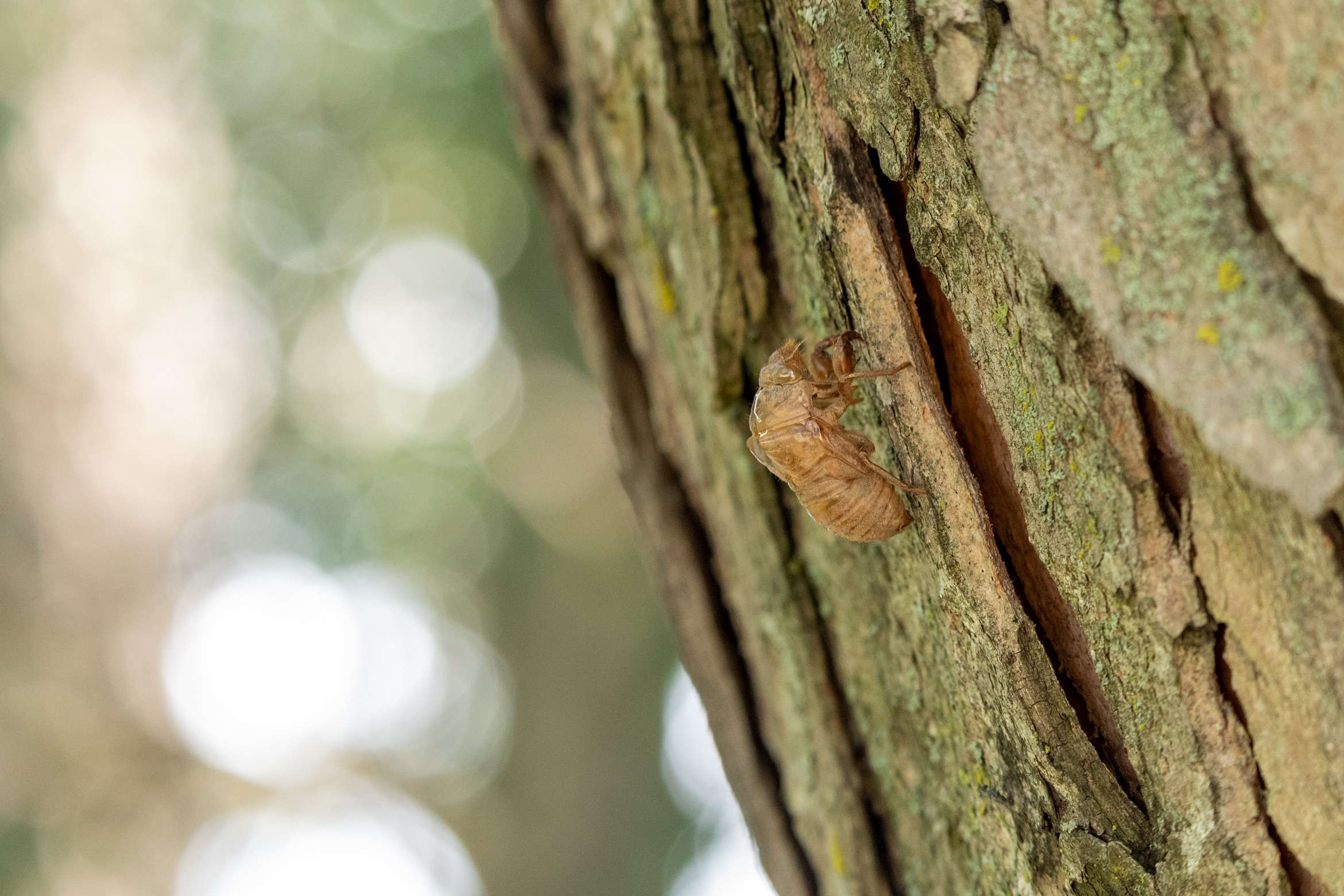 Descriptive text: Exoskeleton of a cicada clinging to a tree