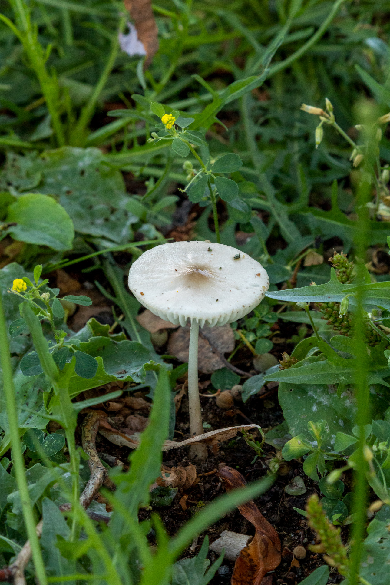 Descriptive text: Wafer-shaped white mushroom with brown centre on a tall slim stalk