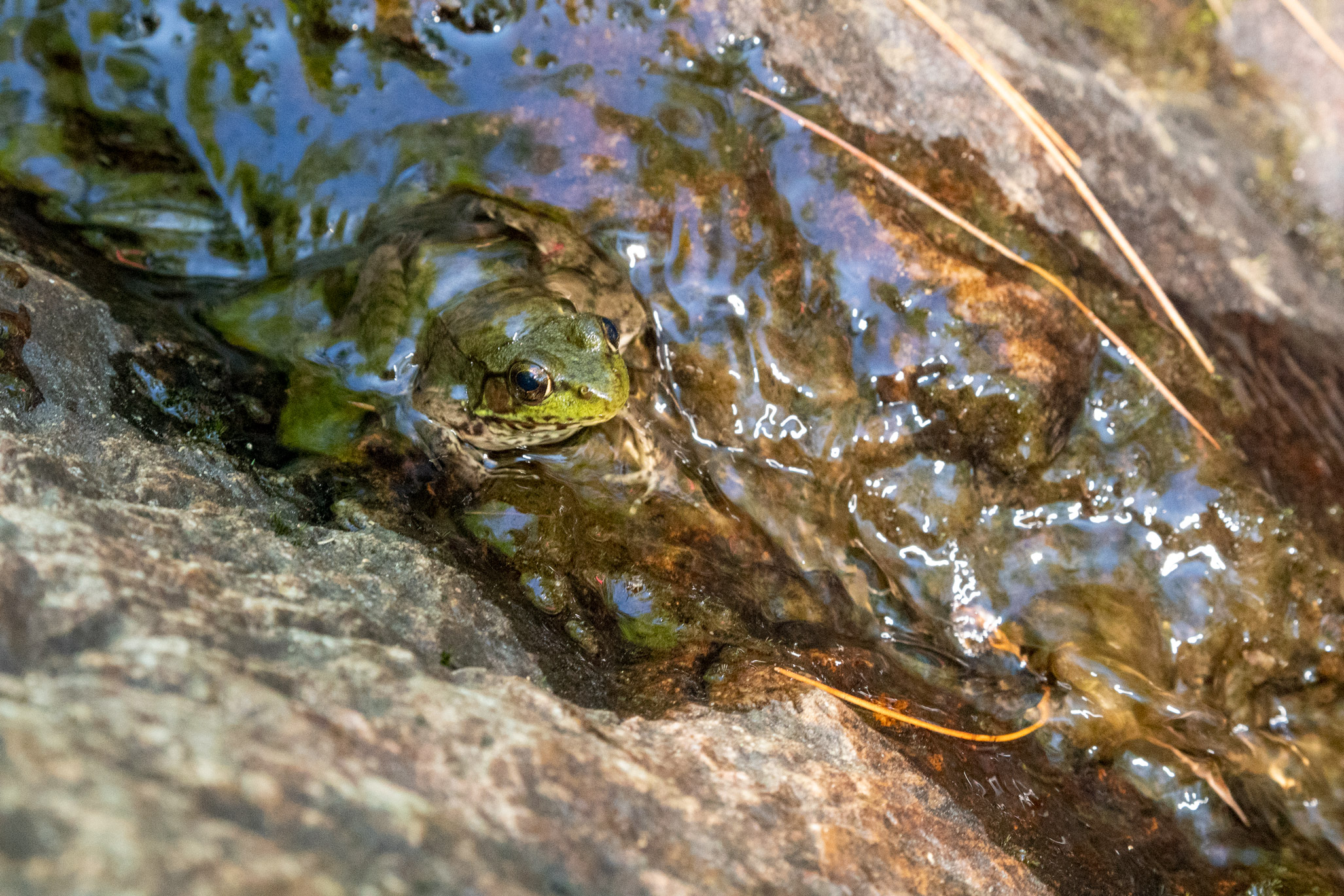 Descriptive text: Frog sitting in shallow water