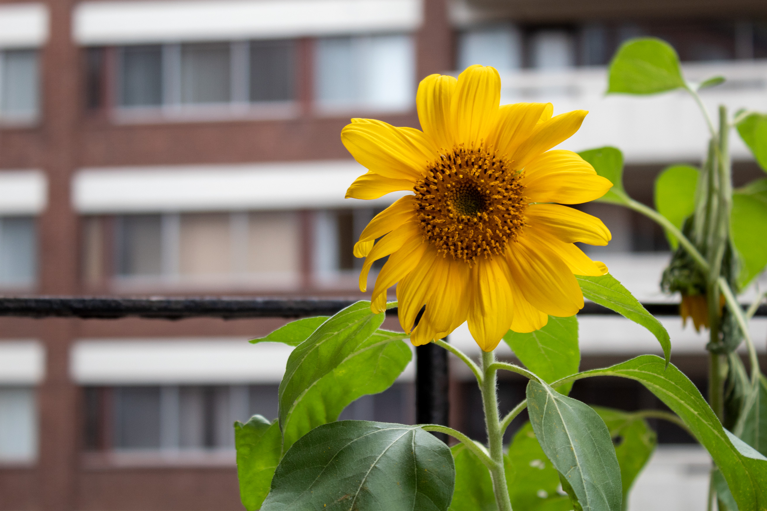 Descriptive text: Bright yellow flower with green leaves and stalk in front of its deceased relative and a blurred building