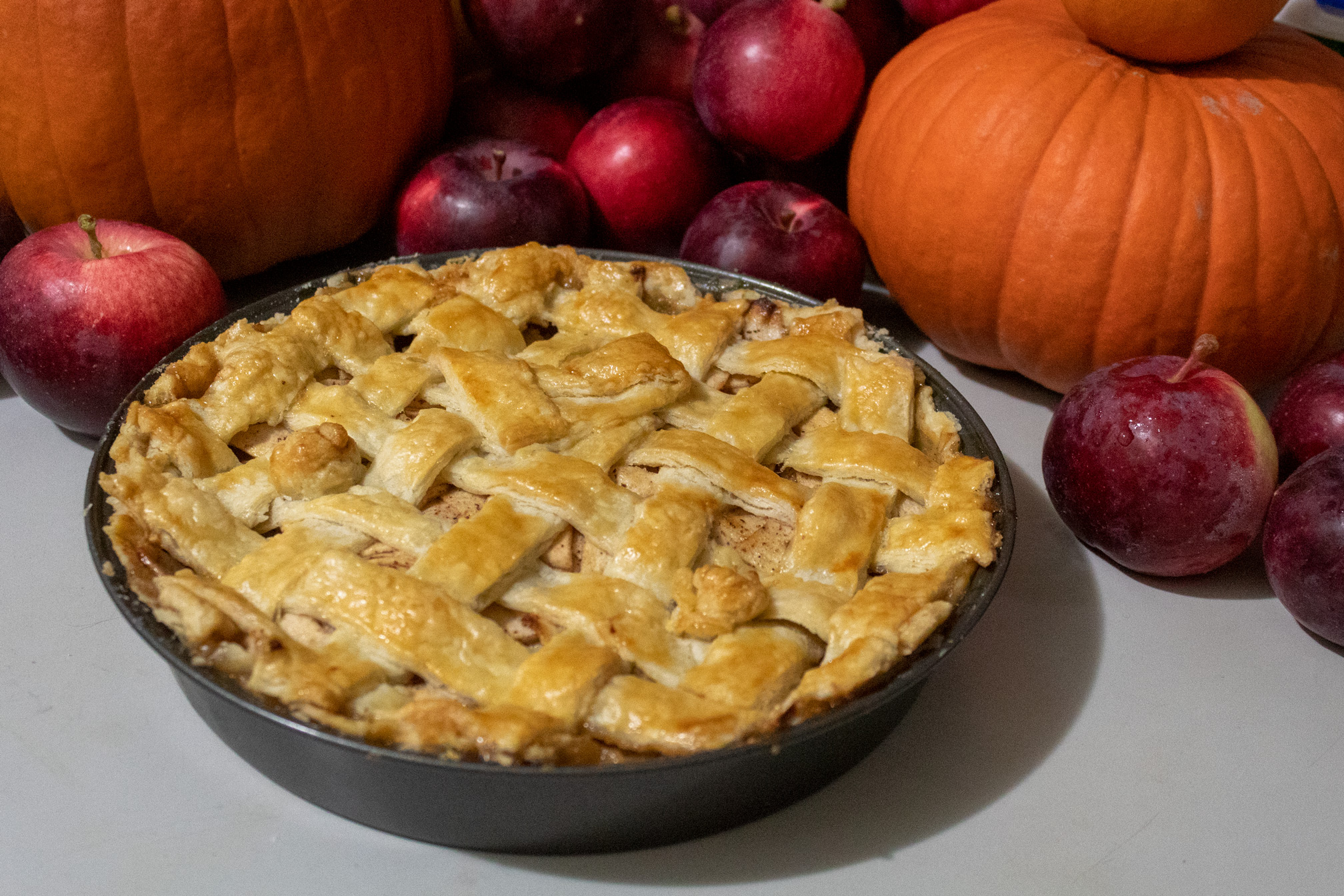 Apple pie with latticed top crust viewed from a skewed angle against a backdrop of Spartan apples and pumpkinsBack to Album Previous Next