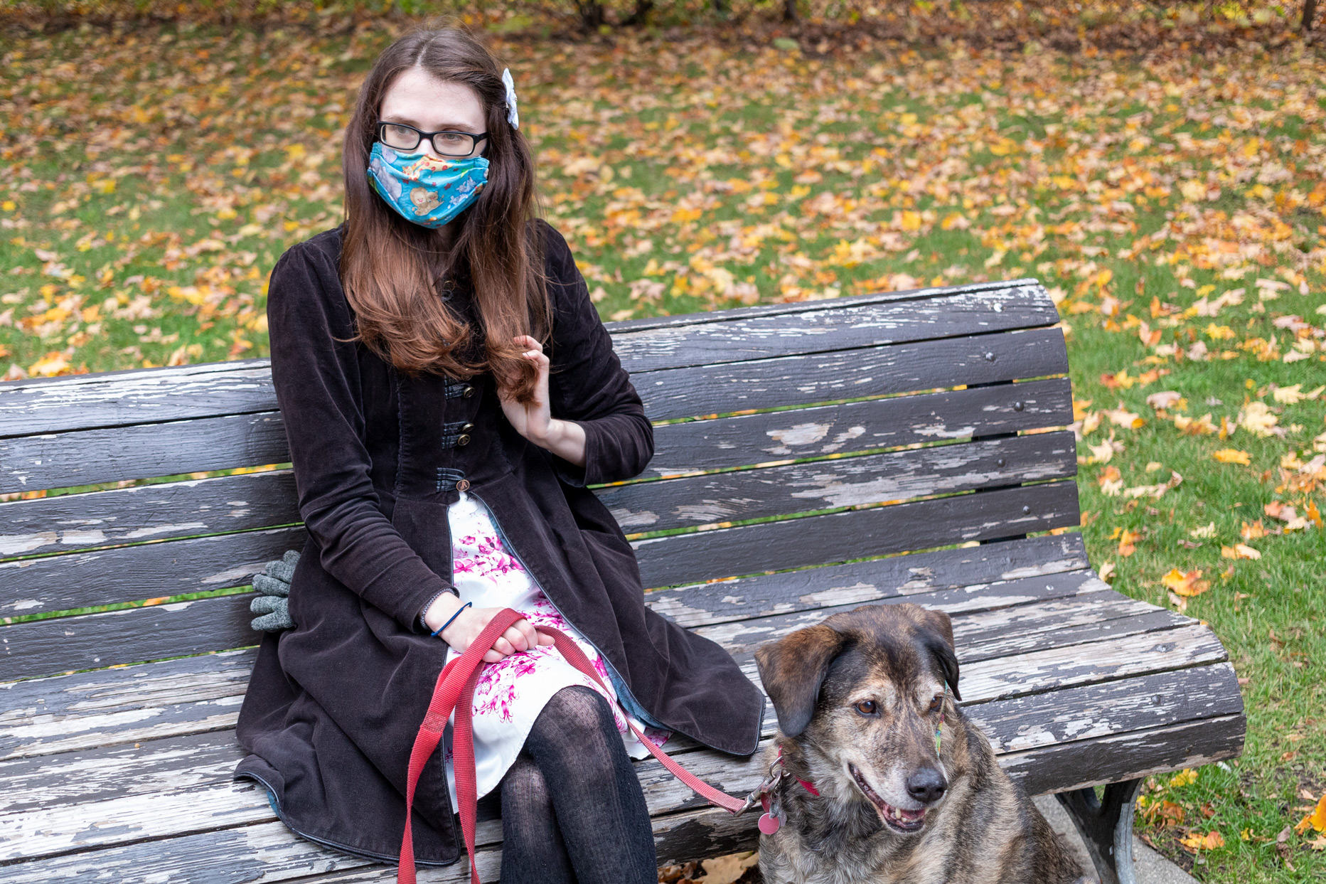 Descriptive text: Woman sitting on bench with dog sitting on the ground beside her in front of a leaf-covered ground