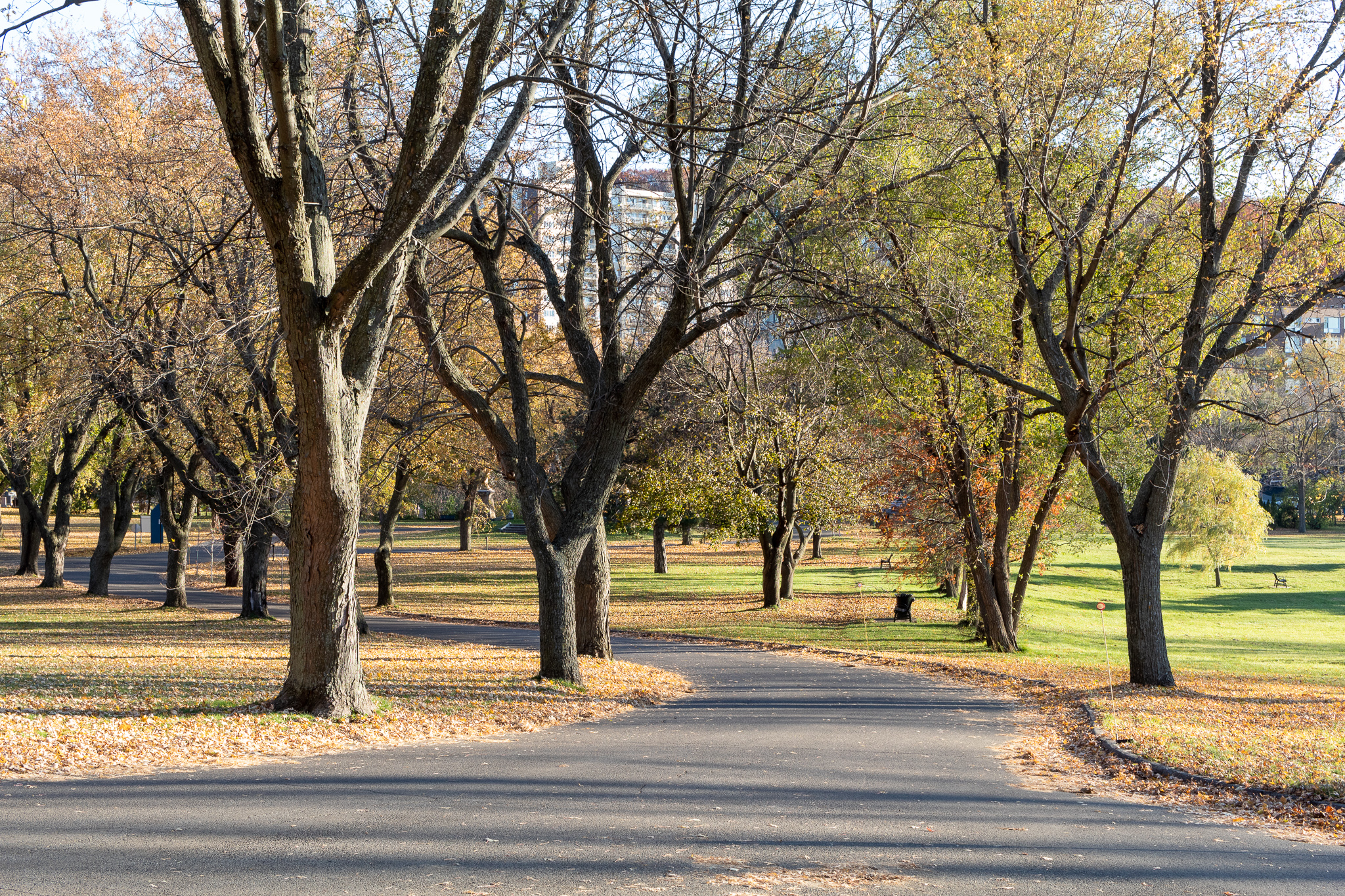 Descriptive text: Winding paved path surrounded by trees whose leaves have turned orange and fallen to the ground