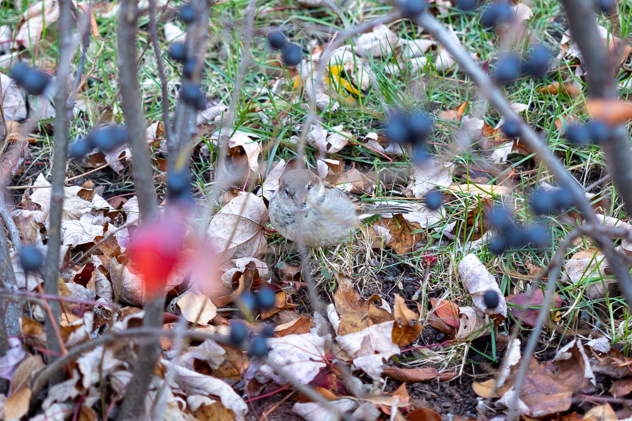Descriptive text: Small bird sitting on the leafy ground behind a blurred foreground of blue berries on bushes