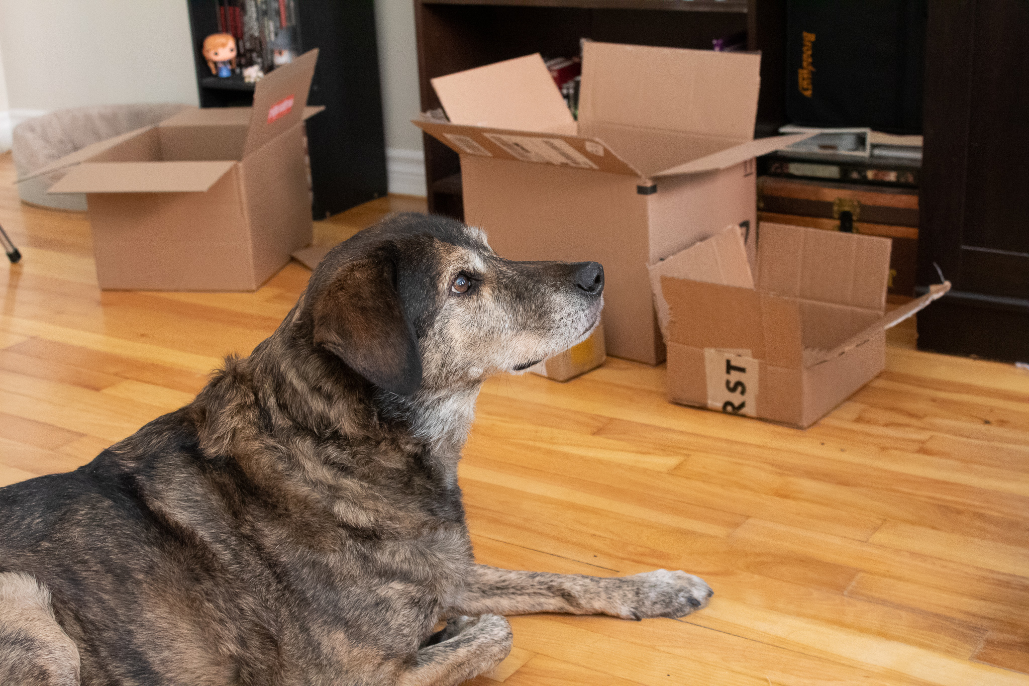 Descriptive text: Brown dog sitting on a hardwood floor in front of cardboard boxes