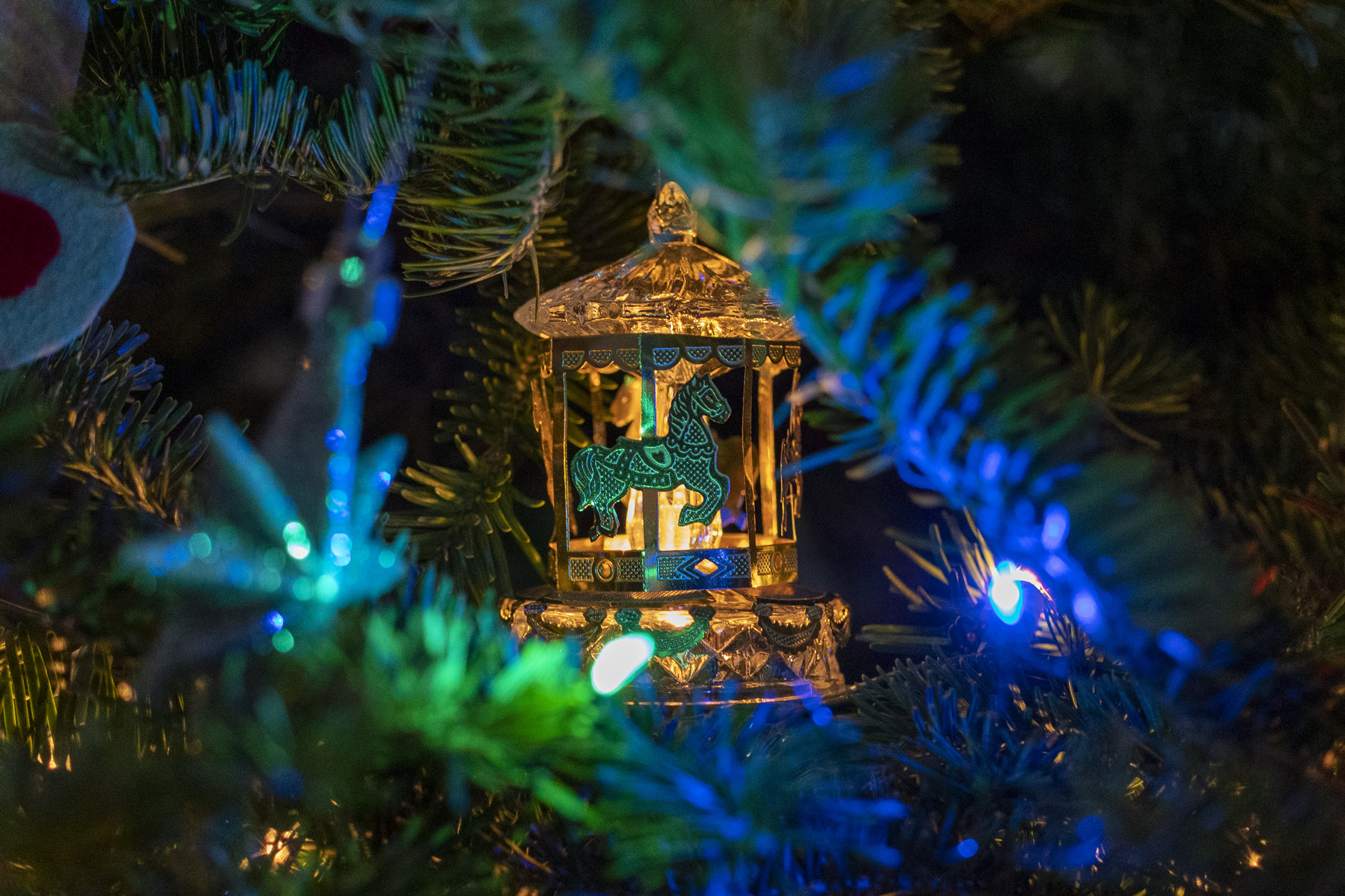 Descriptive text: Glass carousel with metal horses light from within hanging on a Christmas tree surrounded by colourful lights