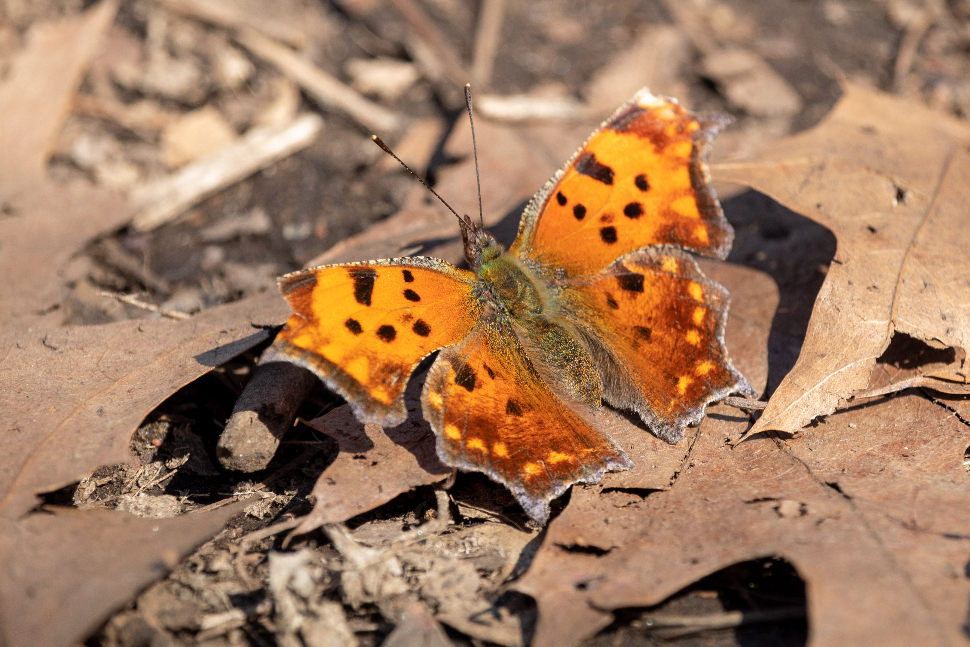 Descriptive text: Fuzzy orange butterfly with black spots sitting on the leaf-covered ground