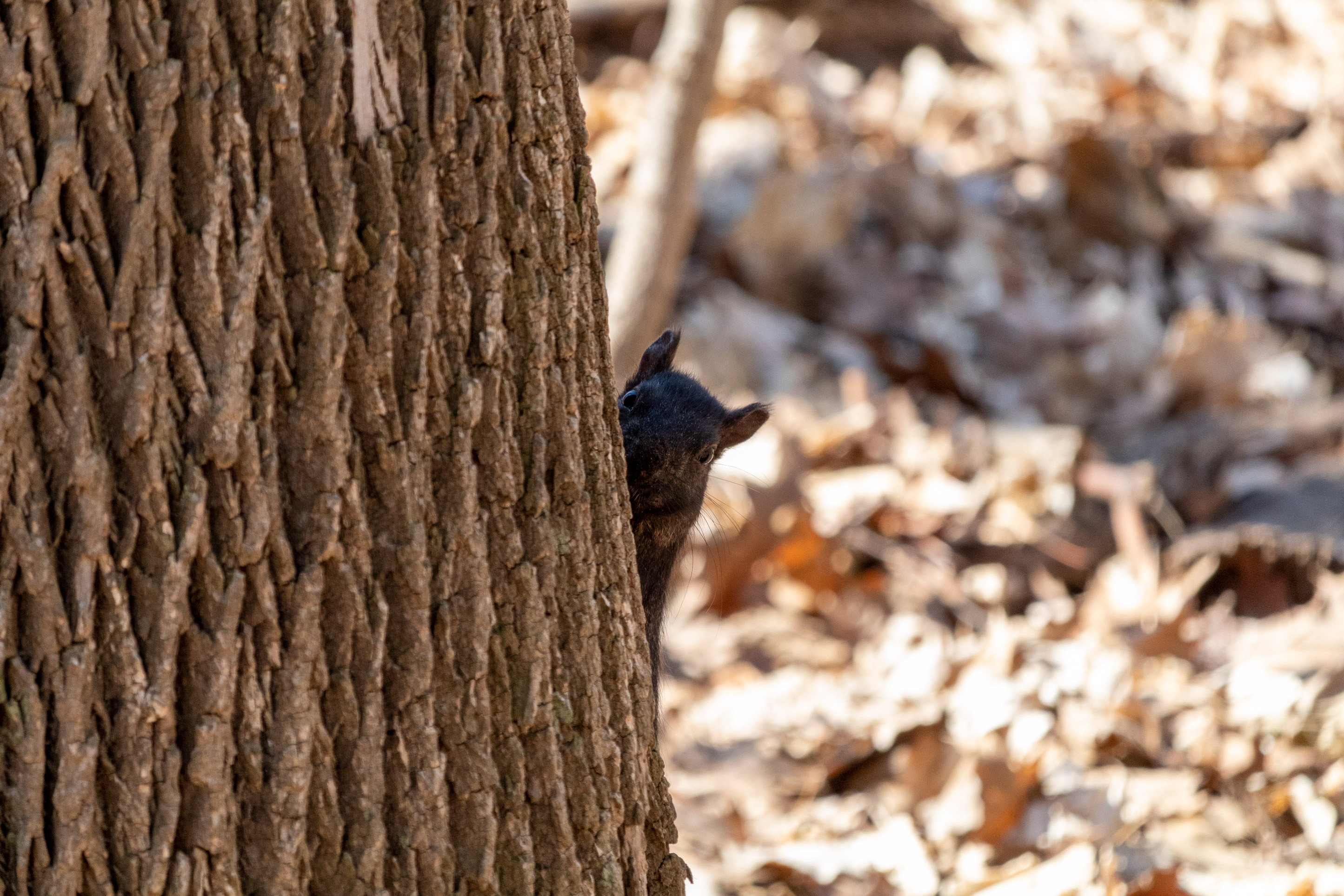 Descriptive text: Black squirrel peeking around the side of a tree trunk