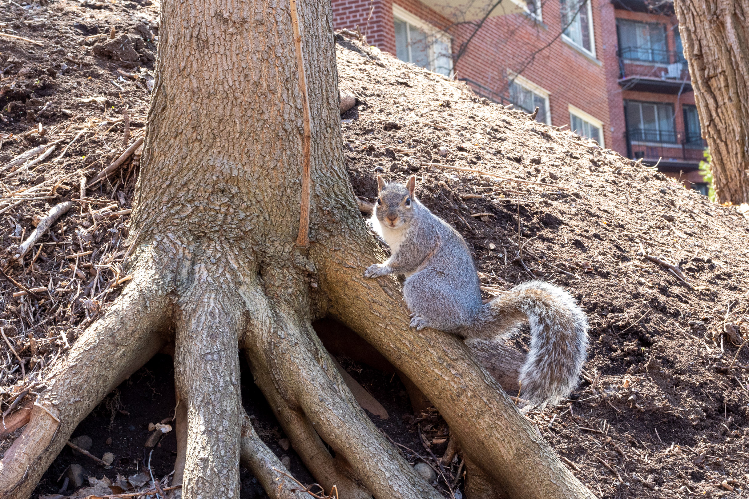 Descriptive text: Large grey squirrel on tree root looking at the camera