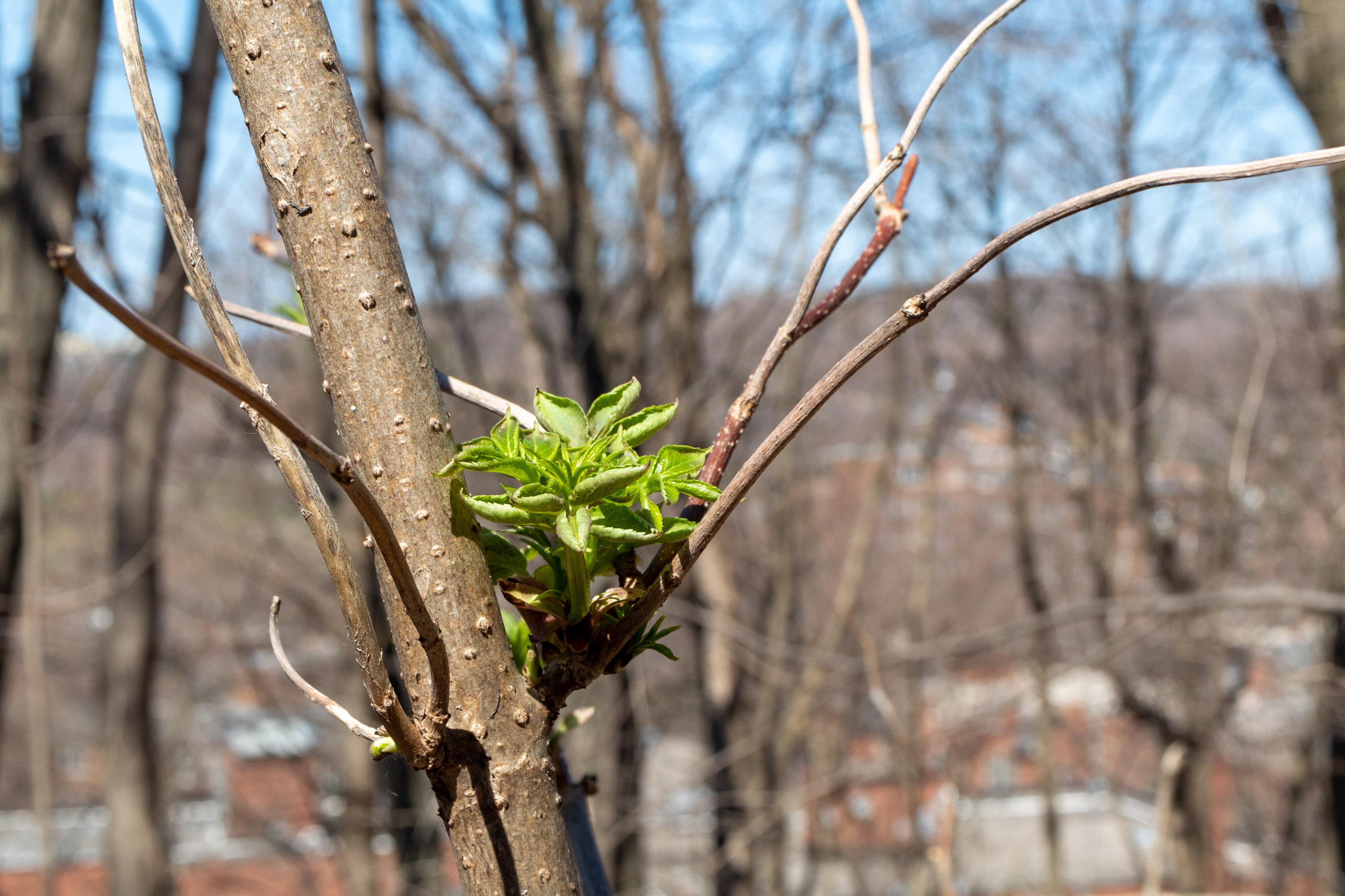 Descriptive text: Small green bud on a slim tree trunk