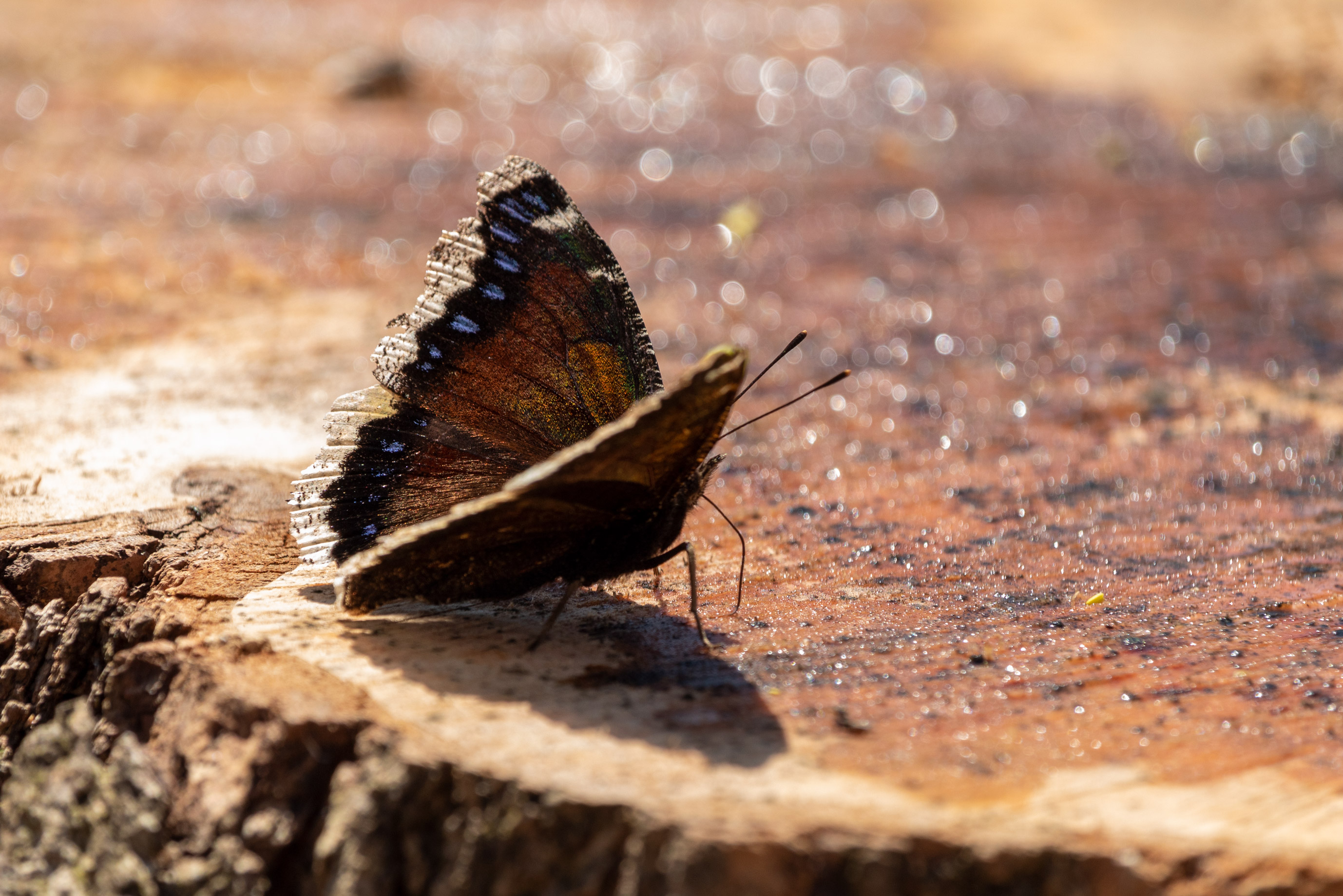 Descriptive text: Butterfly with brown, blue, and white wings sipping sap from a tree stump