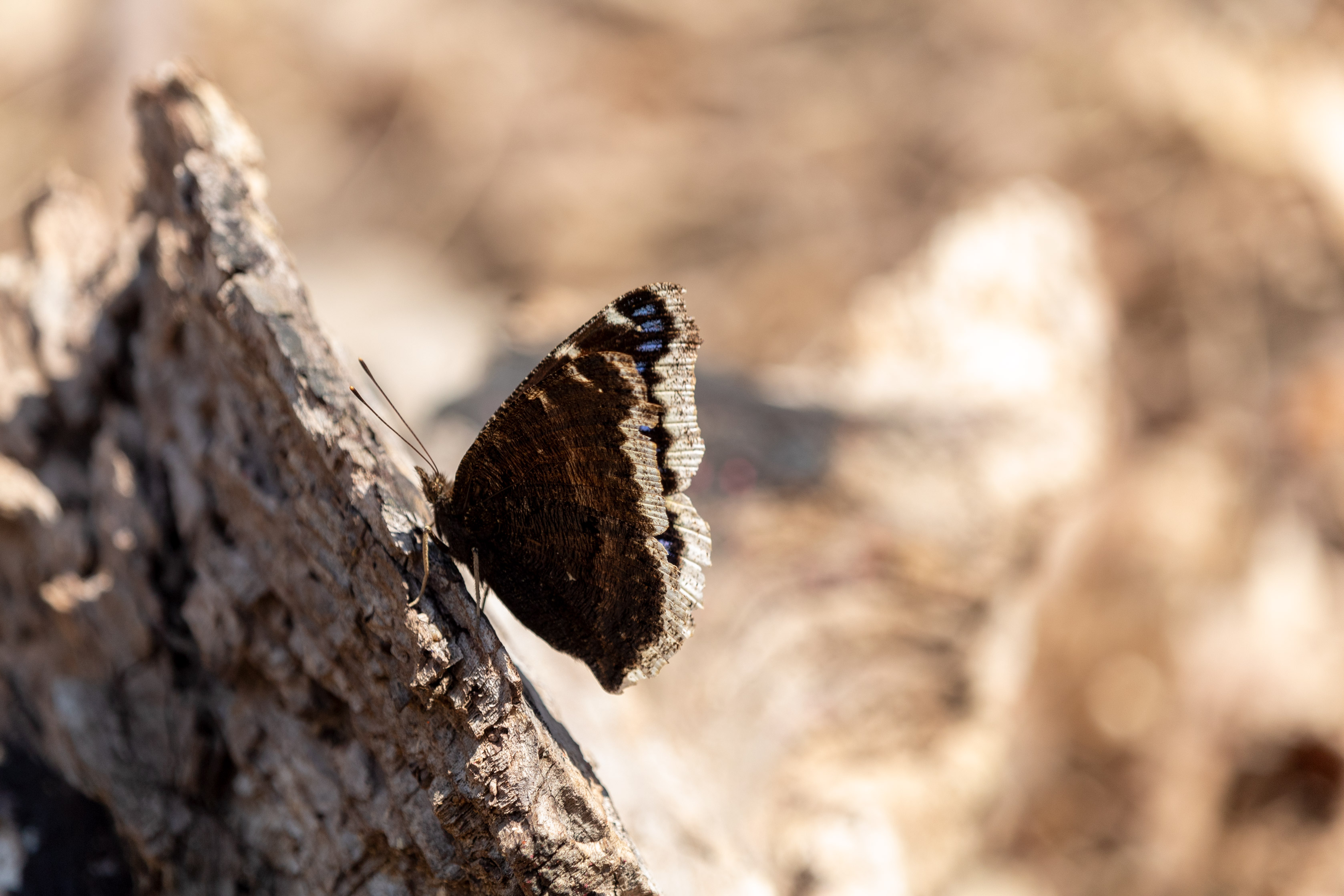 Descriptive text: Butterfly with brown, blue, and white wings sitting on a log