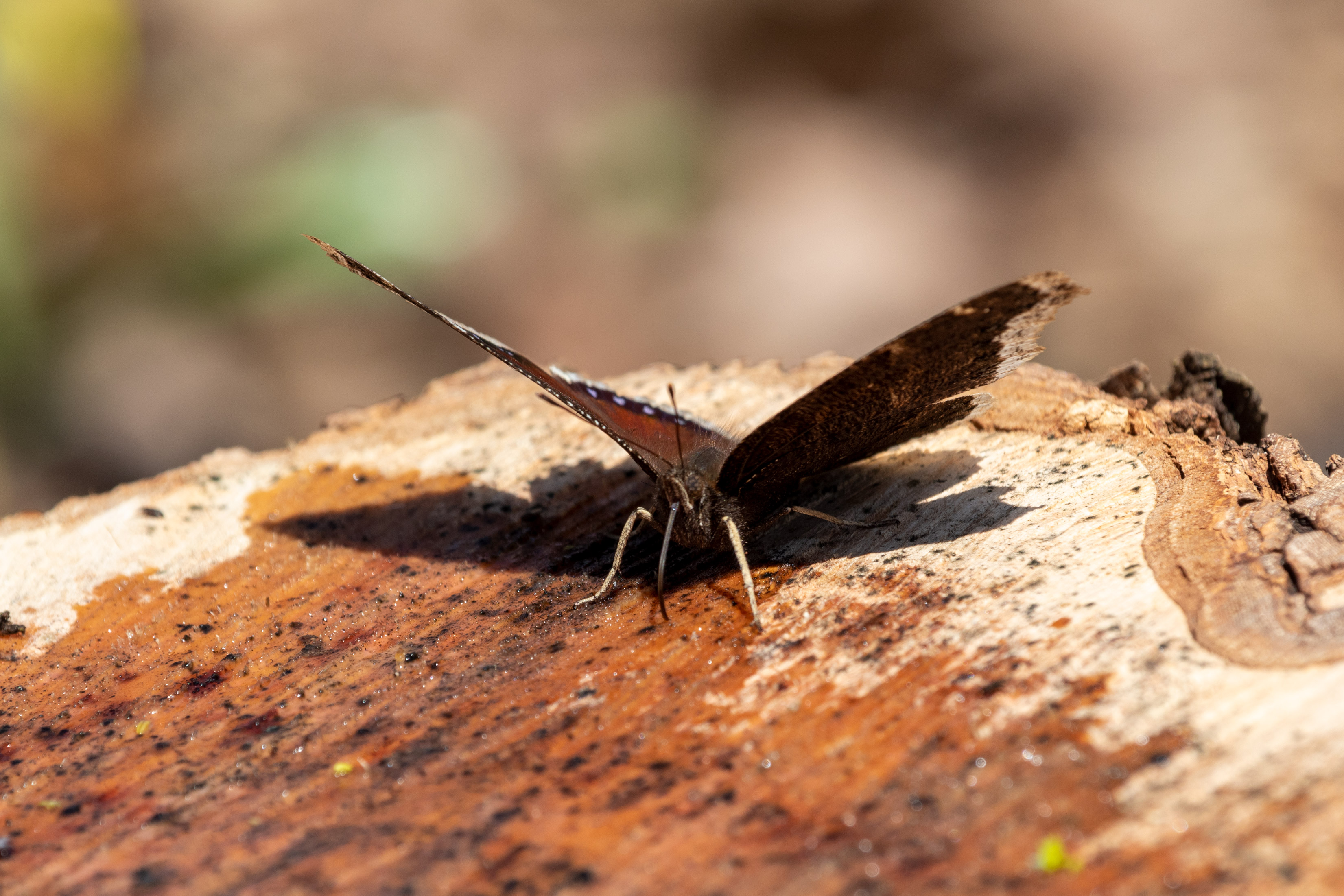 Descriptive text: Butterfly with brown, blue, and white wings sipping sap from a tree stump