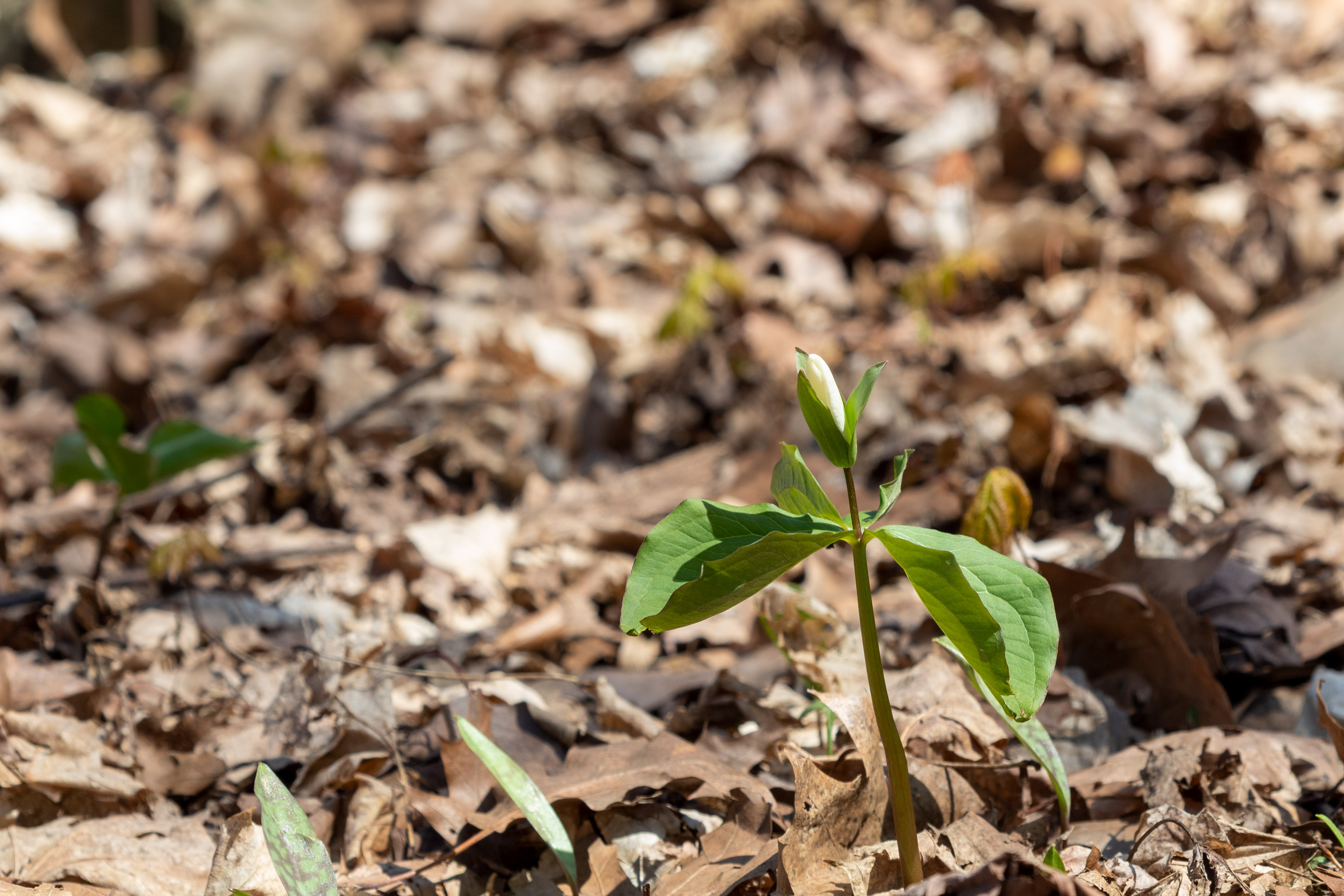 Descriptive text: White flower with three green leaves barely beginning to blossom on the forest floor