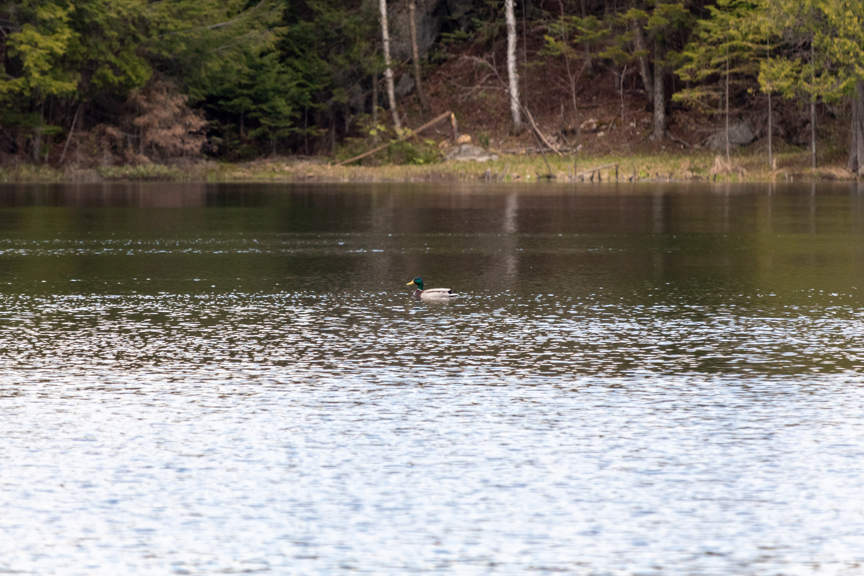 Descriptive text: Duck floating on a rippled lake in front of a tree-laden shore