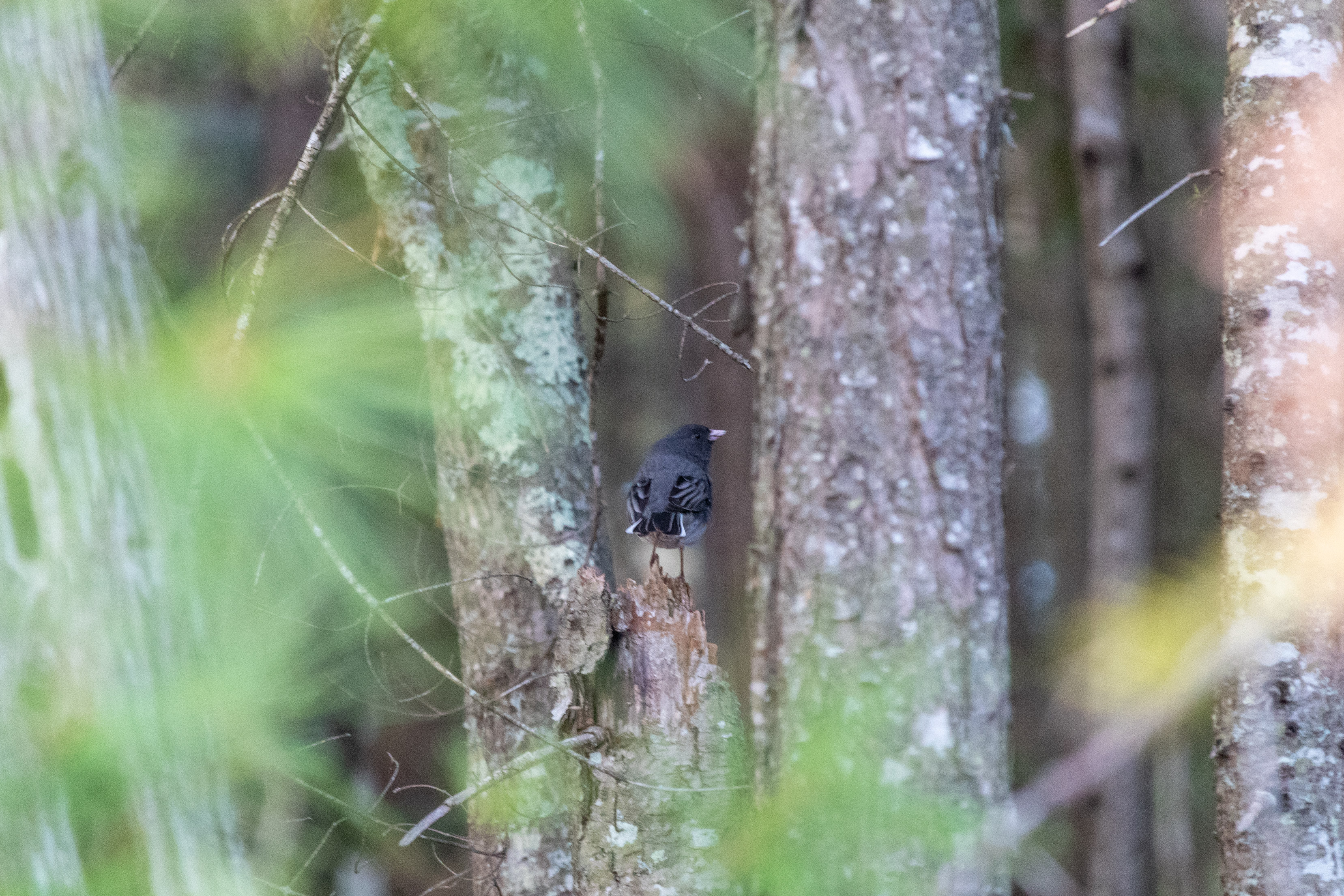 Descriptive text: Bird sitting in a forest surrounded by trees