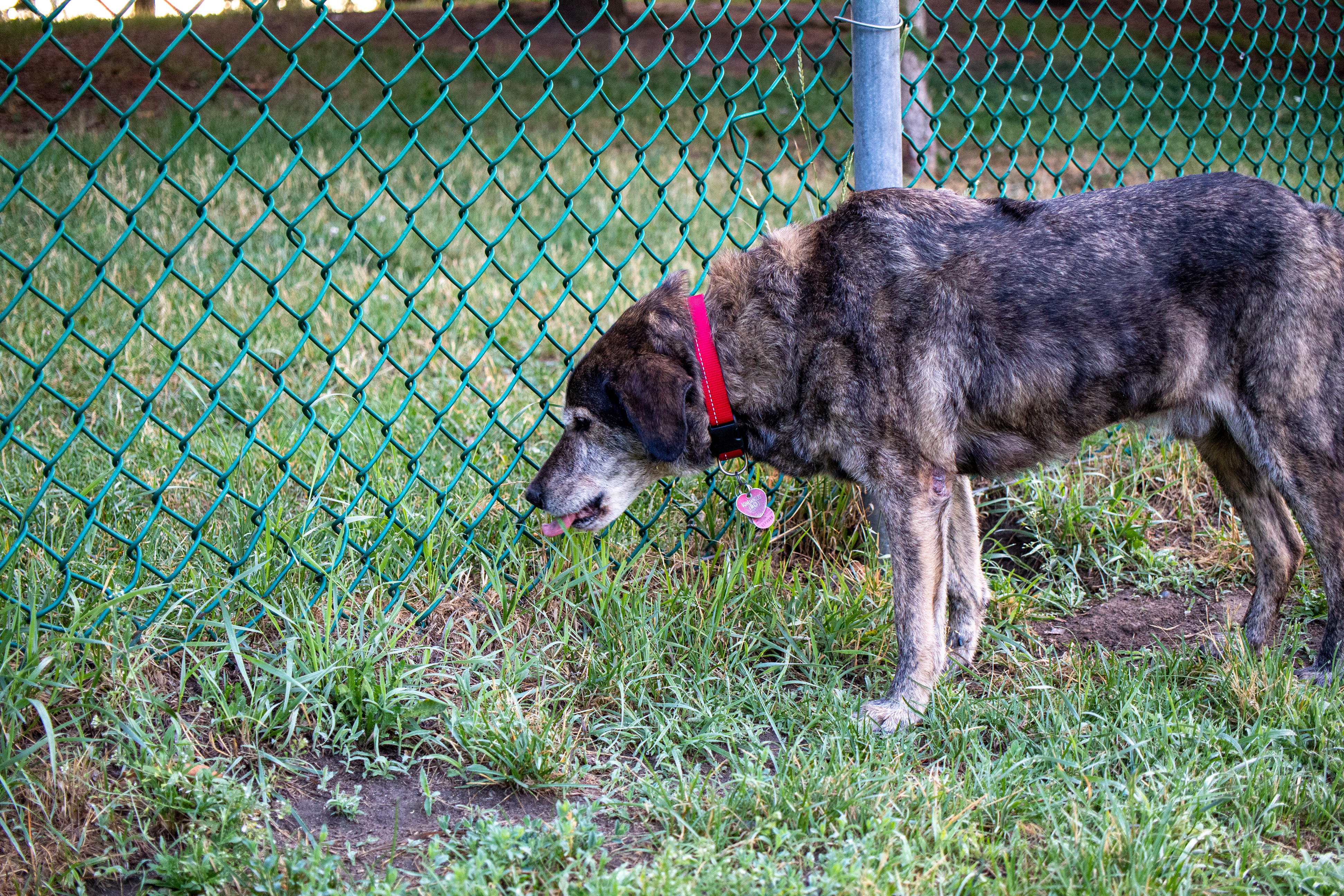 Descriptive text: A very silly dog who only goes to dog parks to eat grass around the fence is doing exactly that