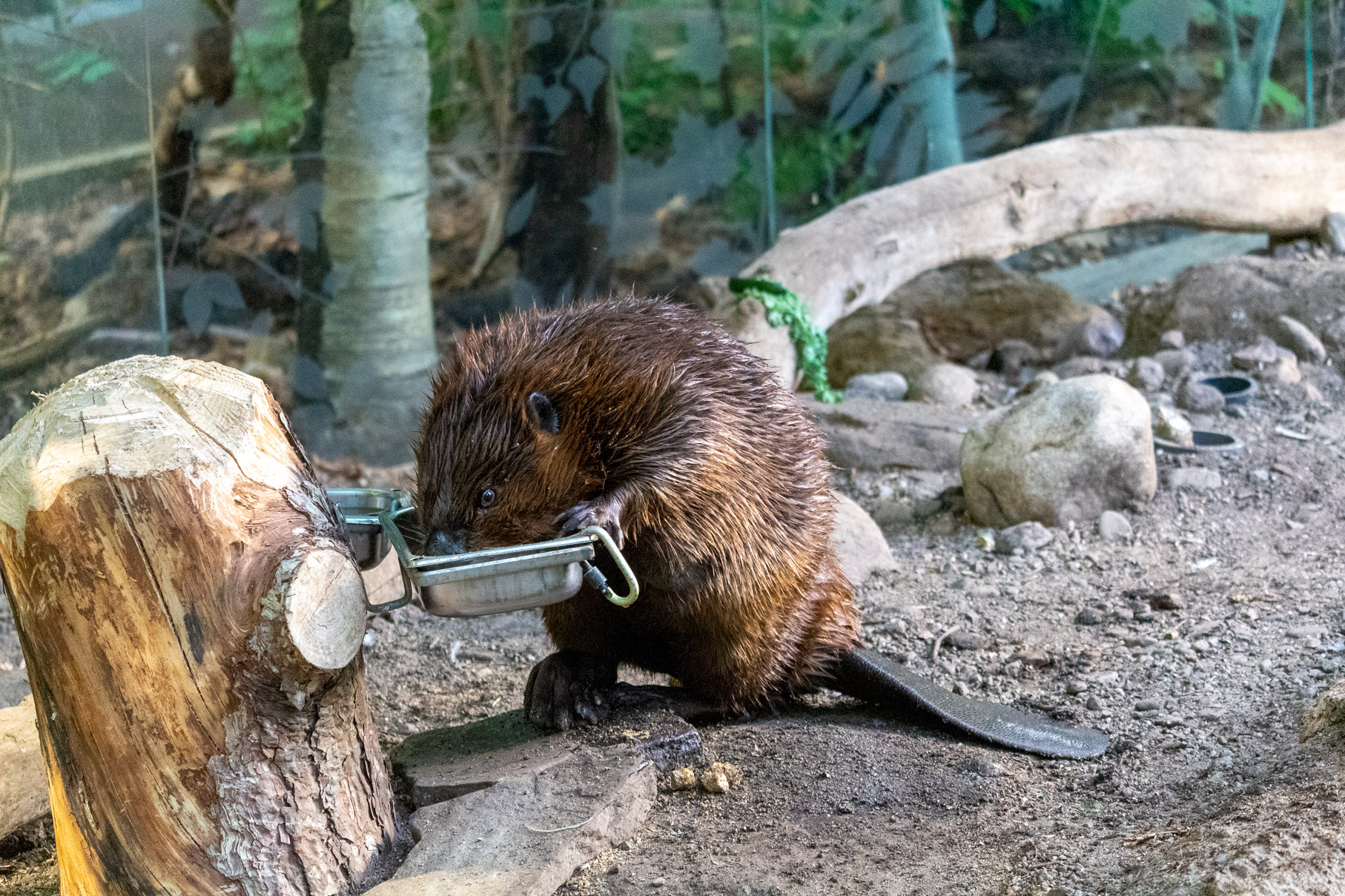 Descriptive text: Beaver eating from a metal tray attached to a log in a wooded environment