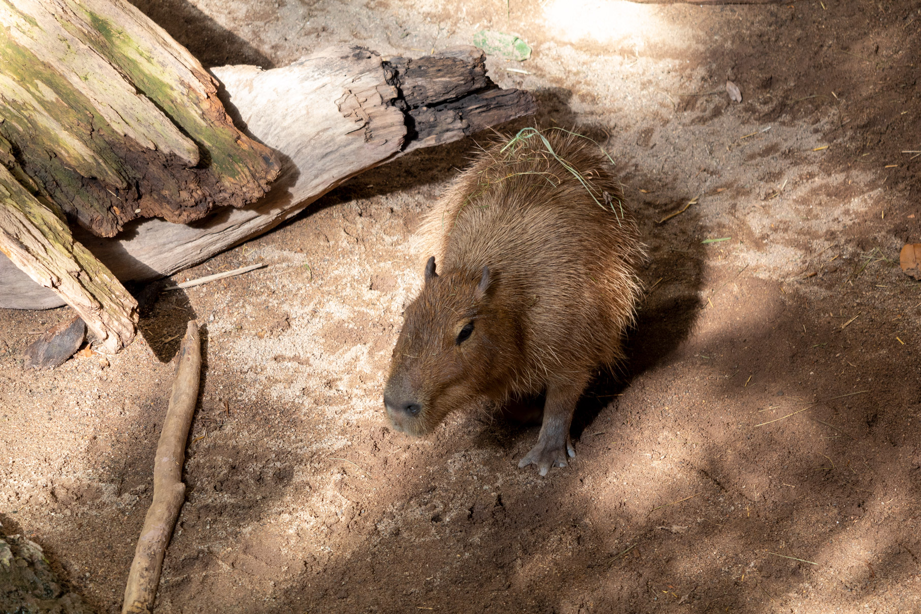 Descriptive text: Capybara walking on a sandy beach beside large pieces of driftwood