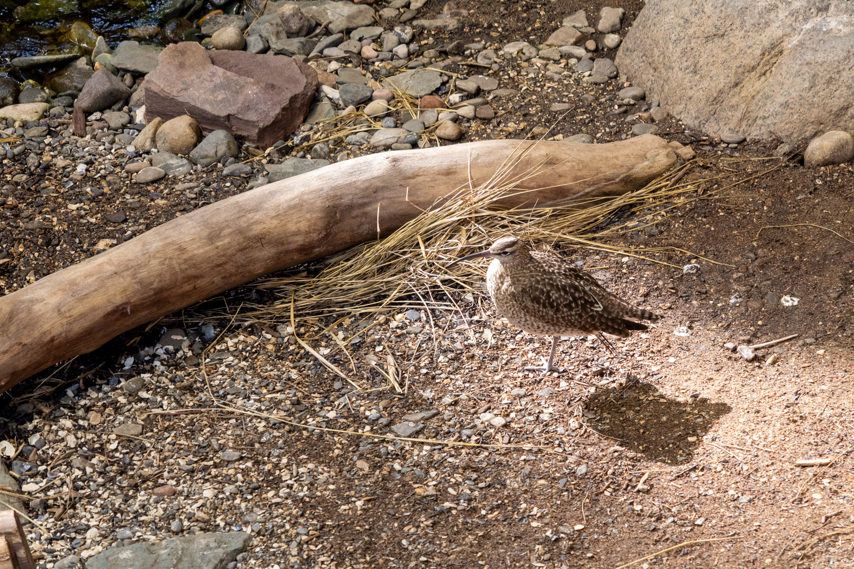 Descriptive text: Small brown speckled bird with a long beak walking on a forest floor