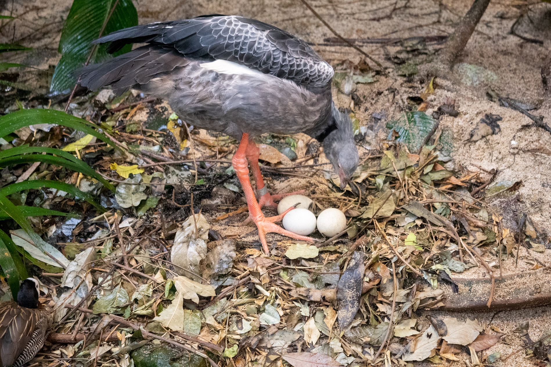 Descriptive text: Large grey bird with orange legs standing over 3 eggs on a forest floor