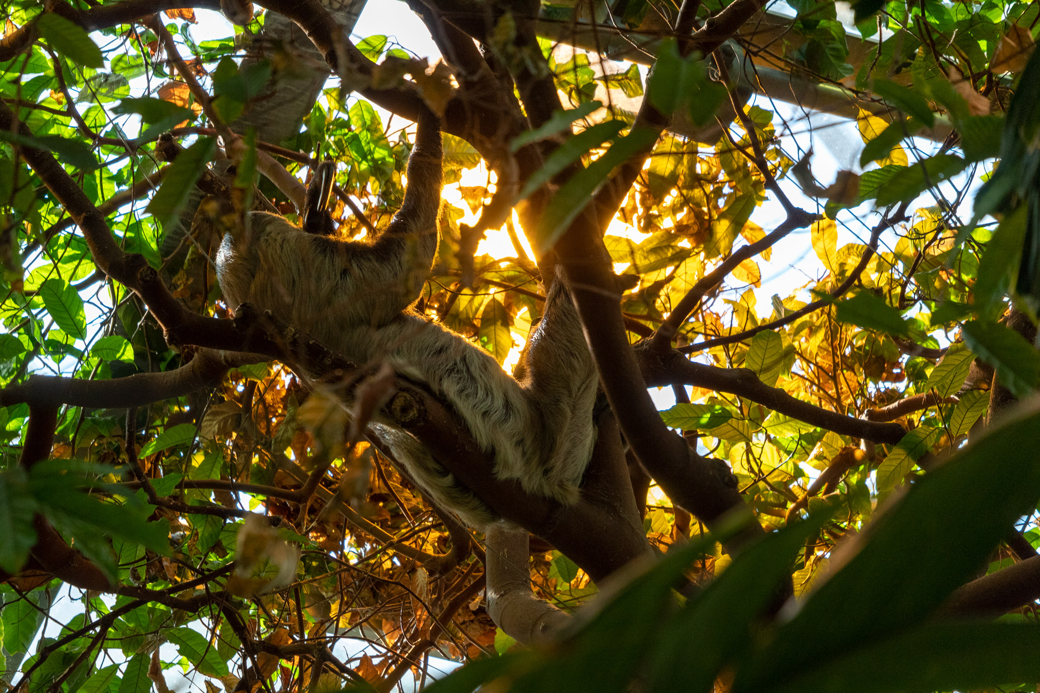 Descriptive text: Sloth in a tree canopy, laying on its back