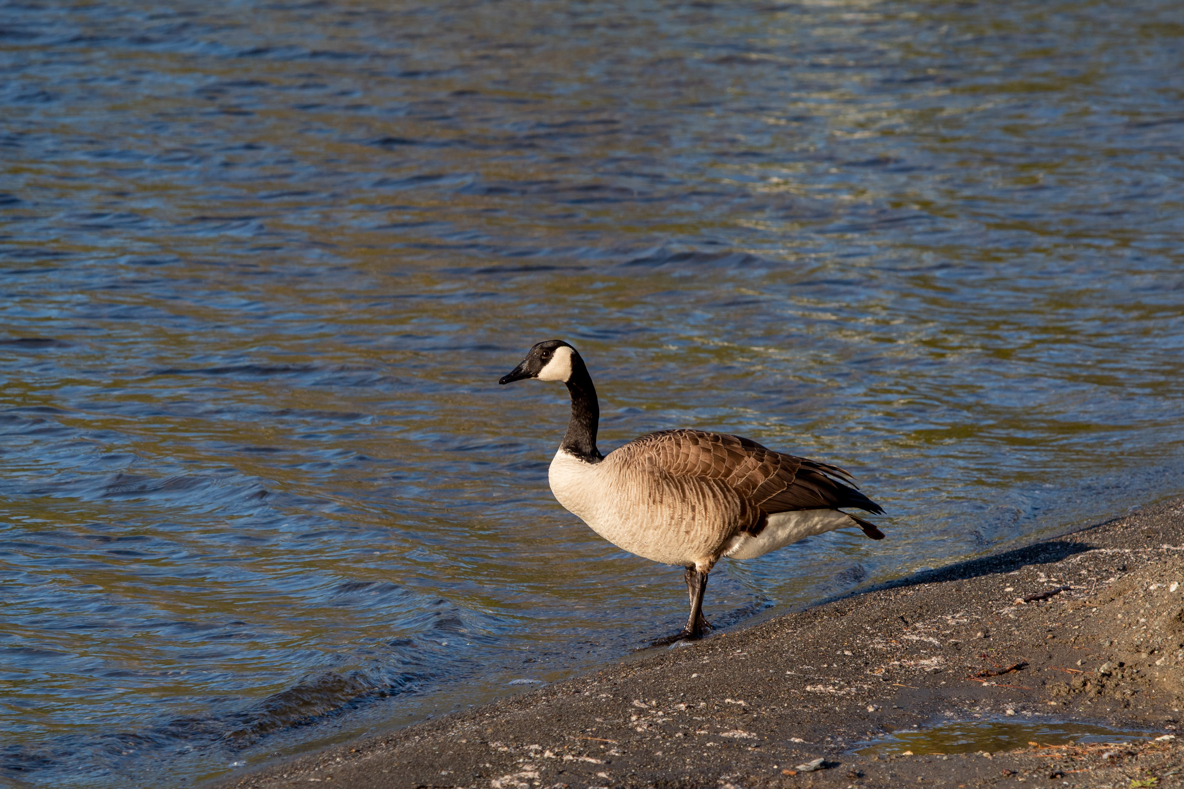 Descriptive text: Canadian Goose walking along the border between a sandy beach and a watery lake