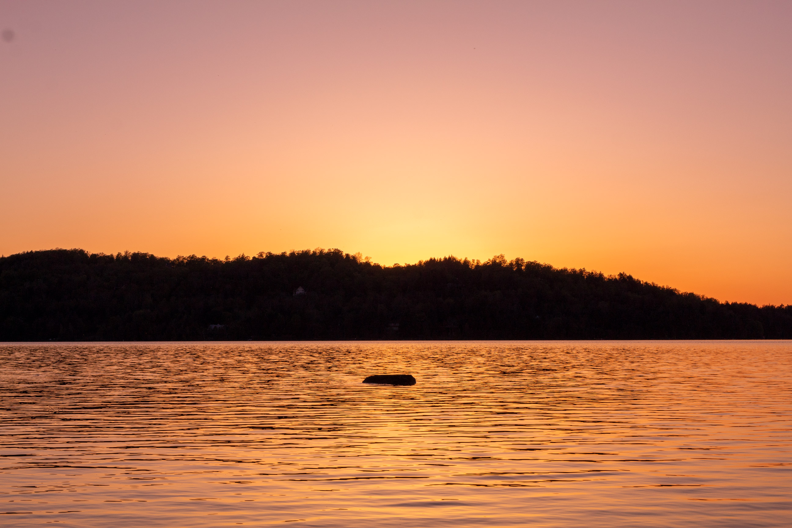 Descriptive text: Colourful orange and pink sunset, with hills blocking the sun, and a lake in front of the mountains with a single rock in it
