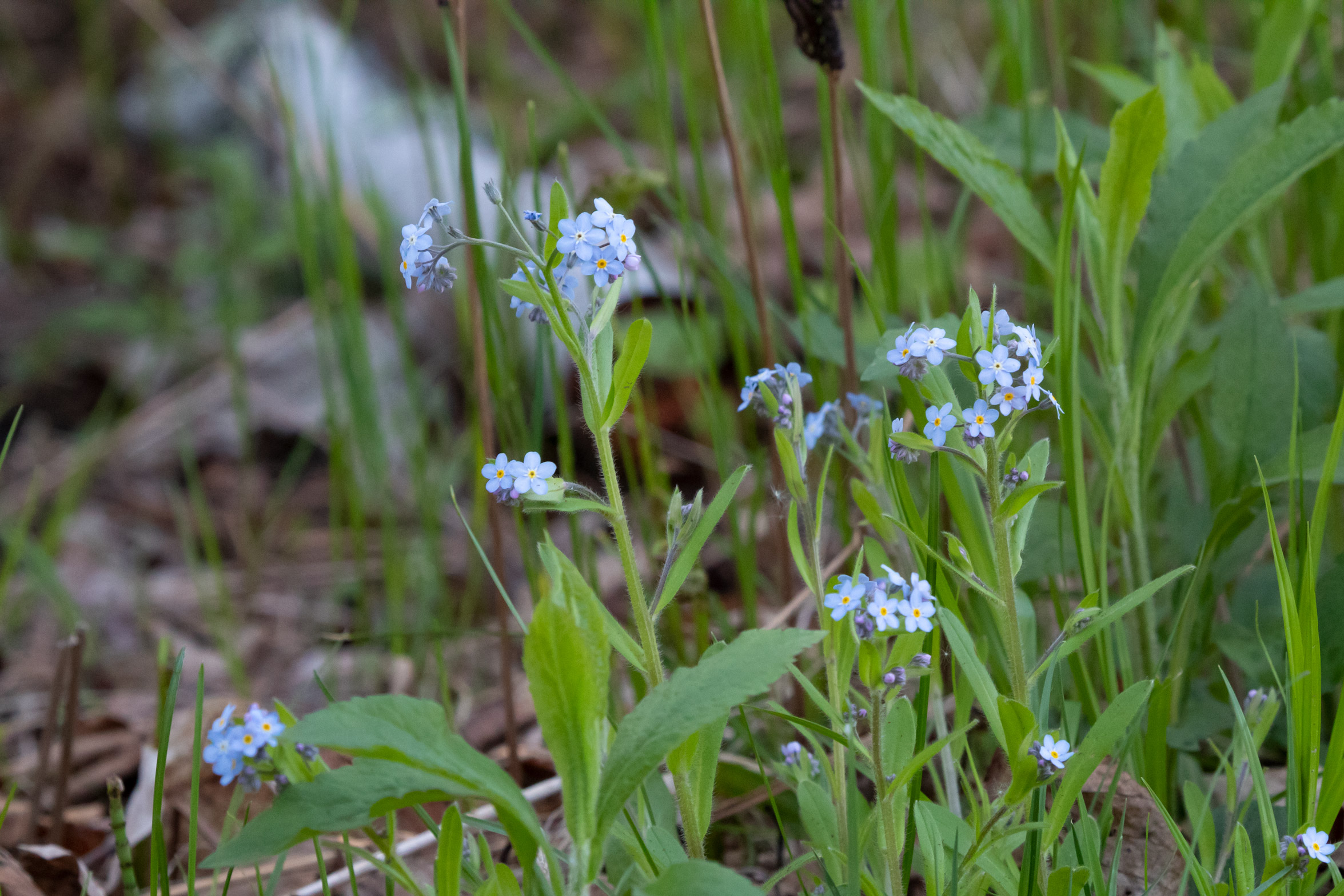 Descriptive text: Tiny blue flowers on a forest floor surrounded by green grass
