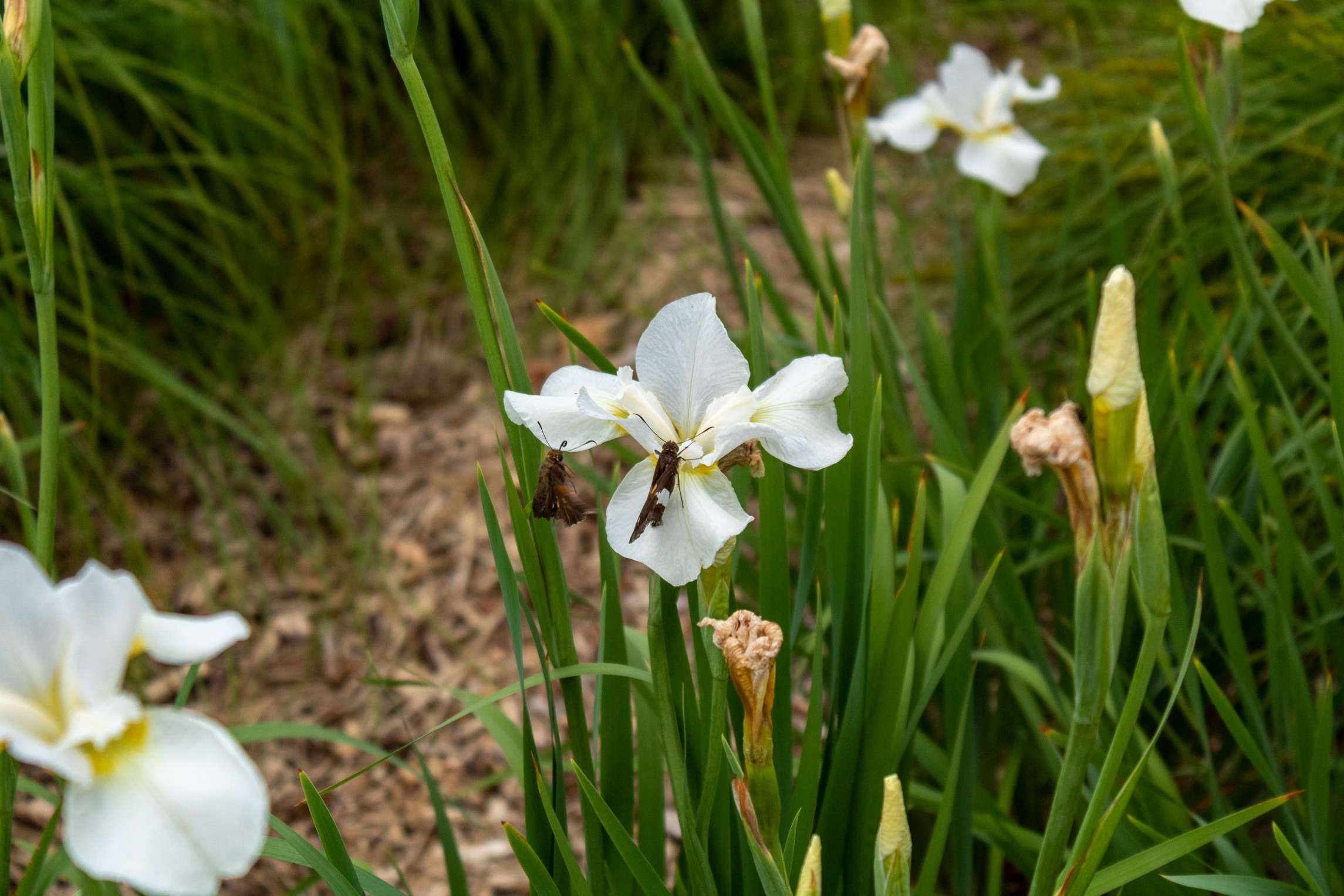 Descriptive text: White iris with a moth resting on it and another moth flying nearby