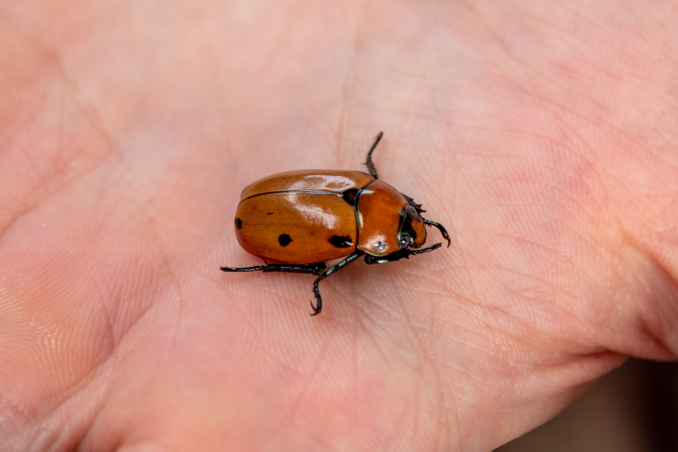 Descriptive text: Large orange beetle with black spots sitting on an open hand