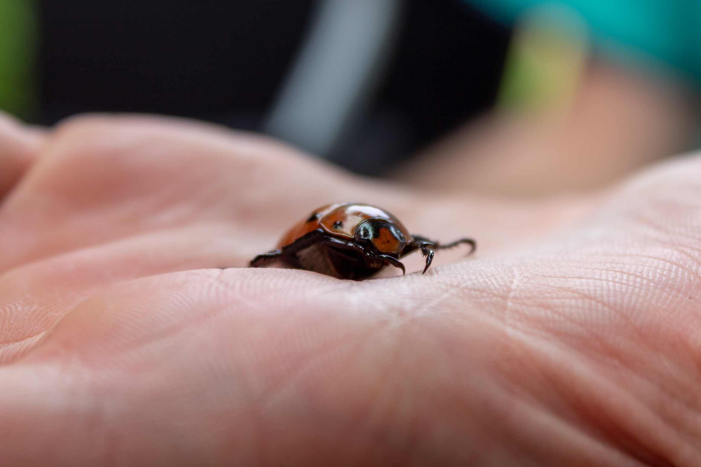 Descriptive text: Large orange beetle with black spots sitting on an open hand viewed from the side