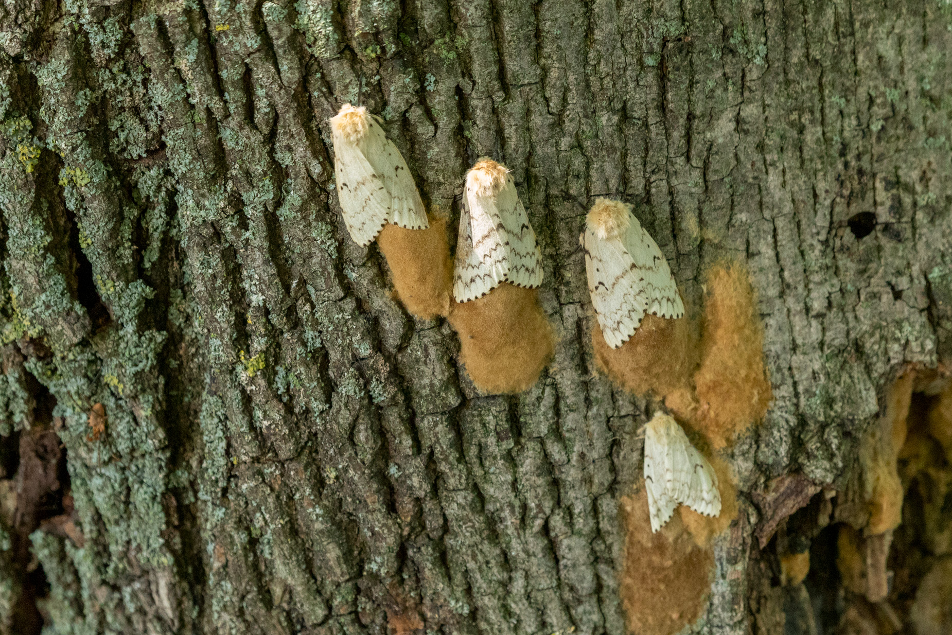 Several tan moths black stripes/spots clinging to tree barkBack to Images Previous Next