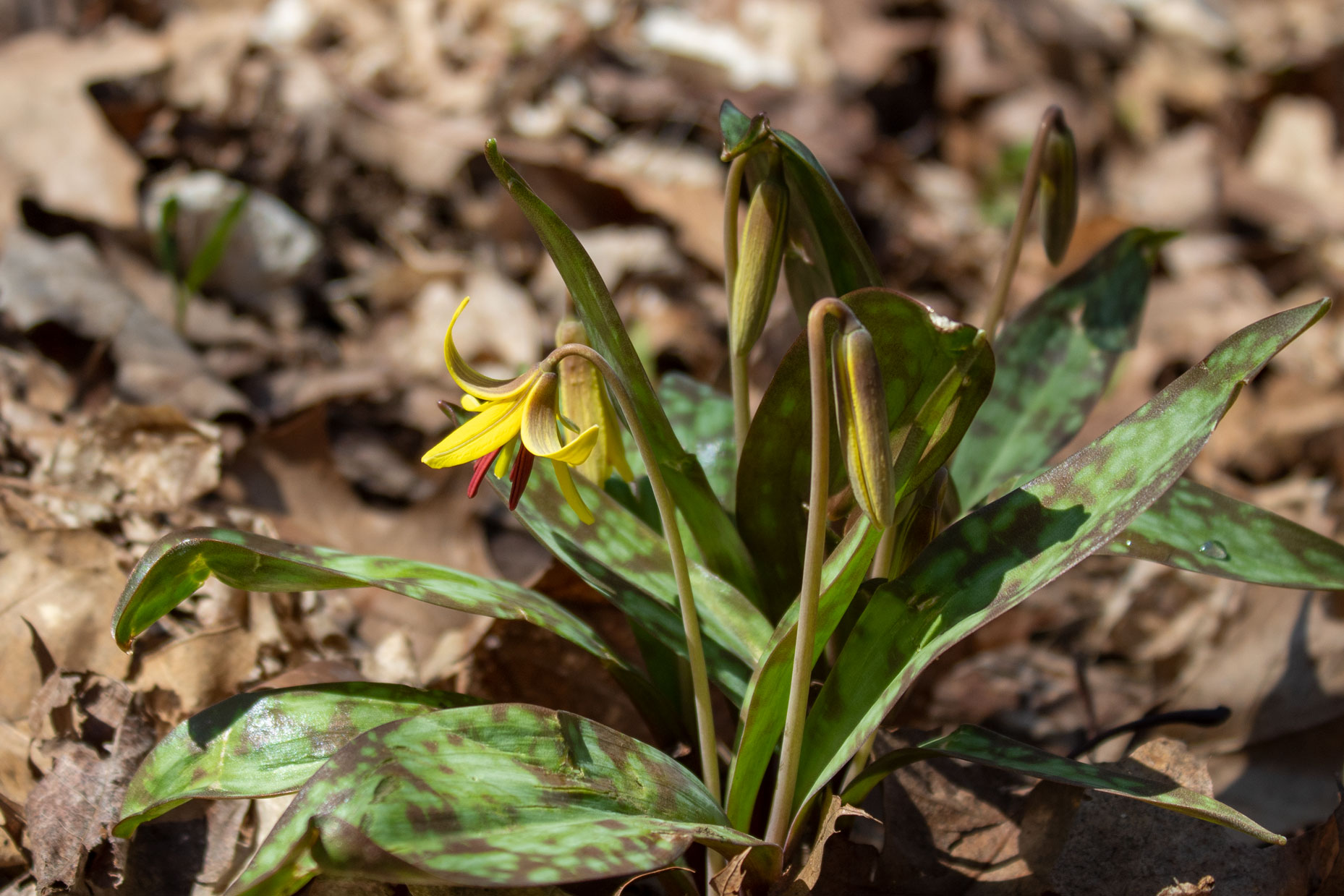 Descriptive text: Yellow flower with wide patchy green/brown leaves