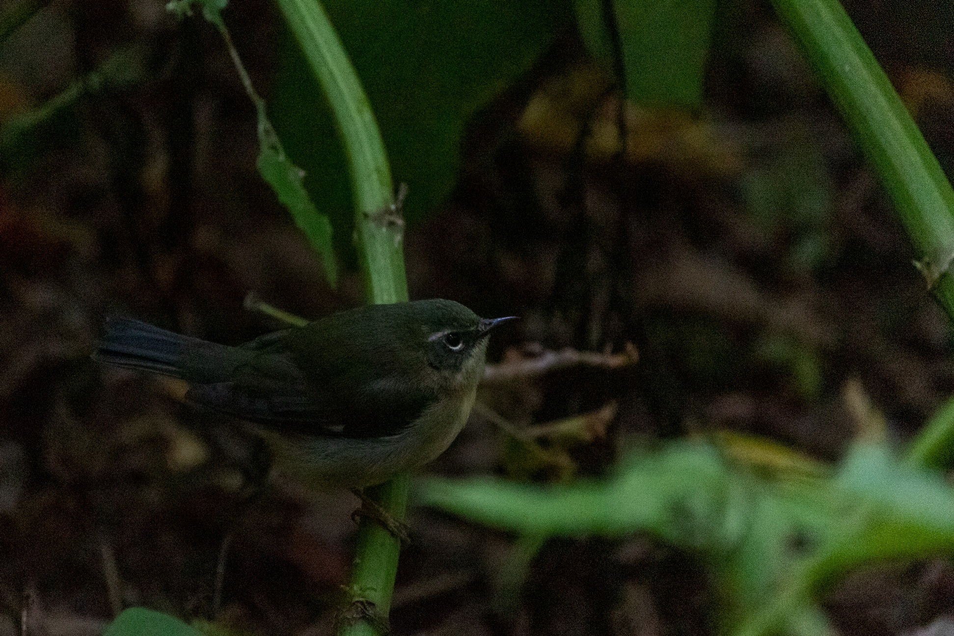 Descriptive text: Dark green bird with a lighter belly sitting on a green branch