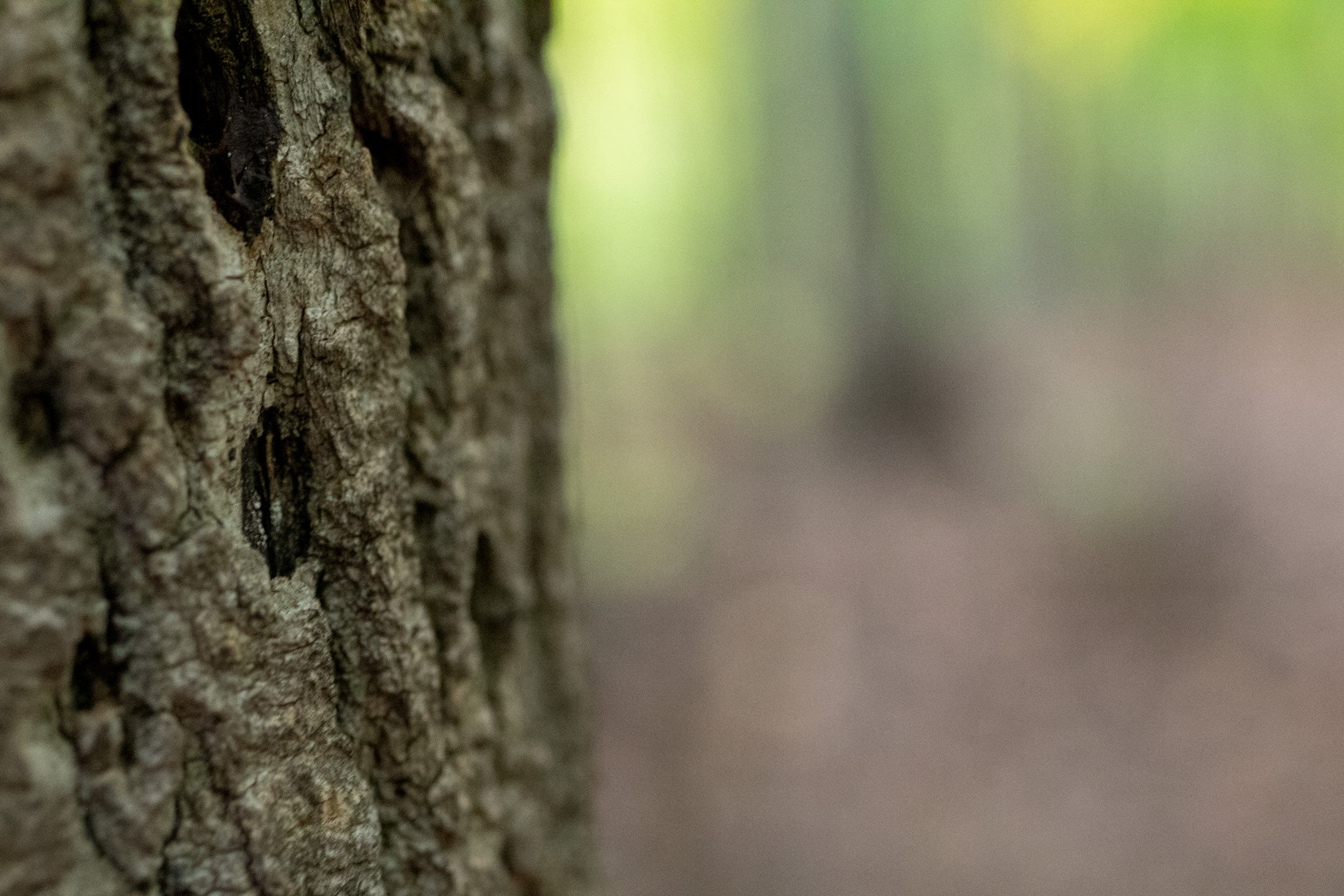 Descriptive text: Macro shot of tree bark covered in healed woodpecker holes in front of an out-of-focus background