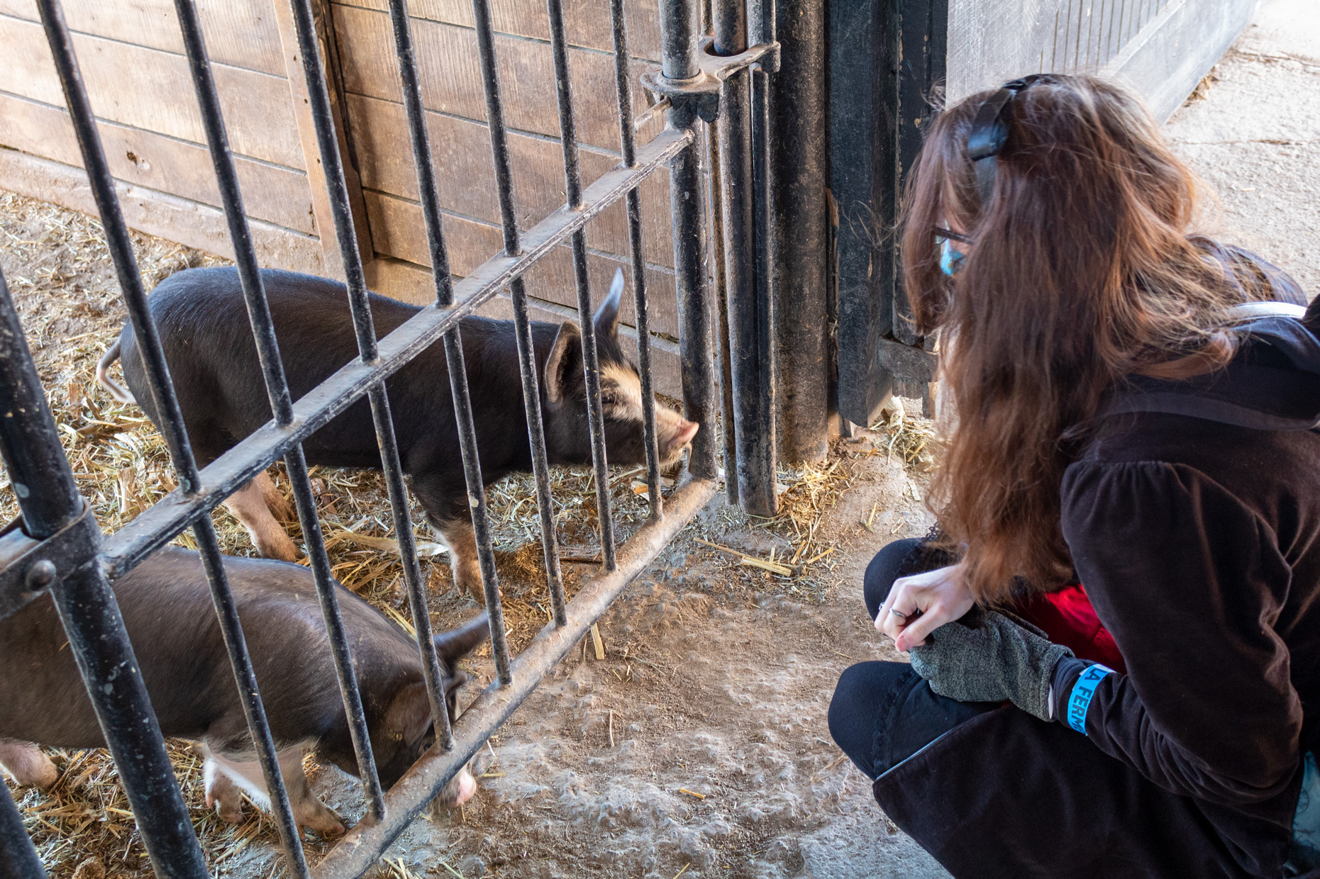 Descriptive text: Small piglets separated by a black metal bar fence from a crouching woman in a black coat