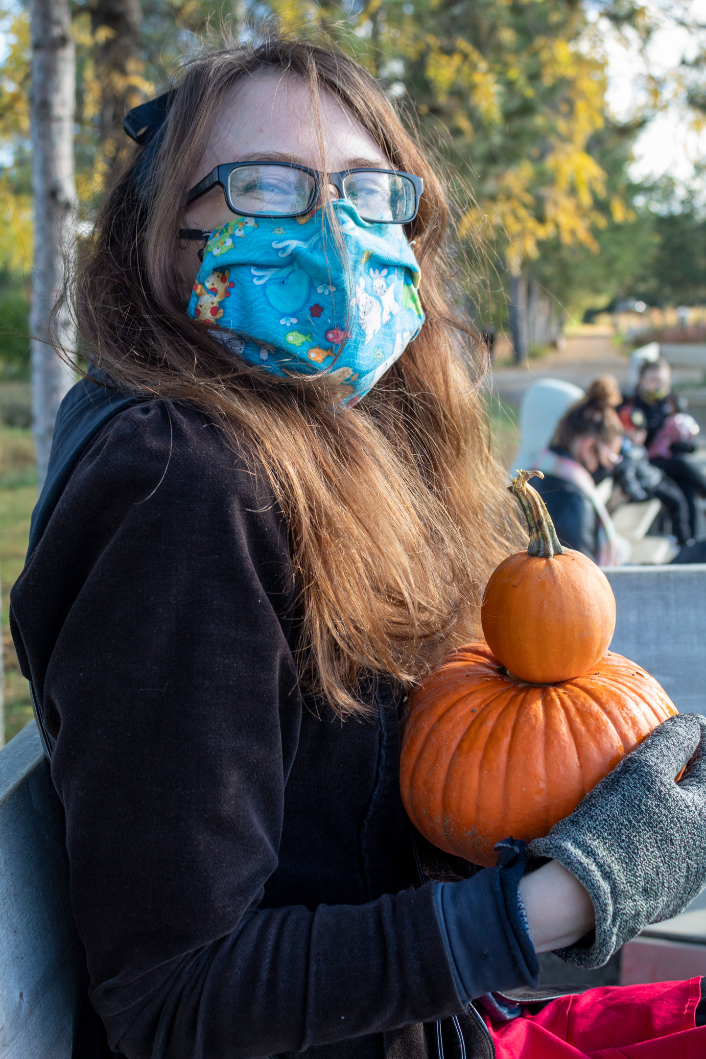 Descriptive text: Woman sitting in a wagon pulled by a tractor and holding two pumpkins stacked on top of each other, one of which is small and the other one is exceptionally tiny; the woman looks positively delighted